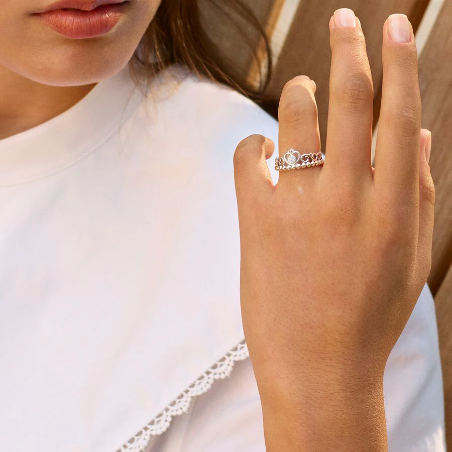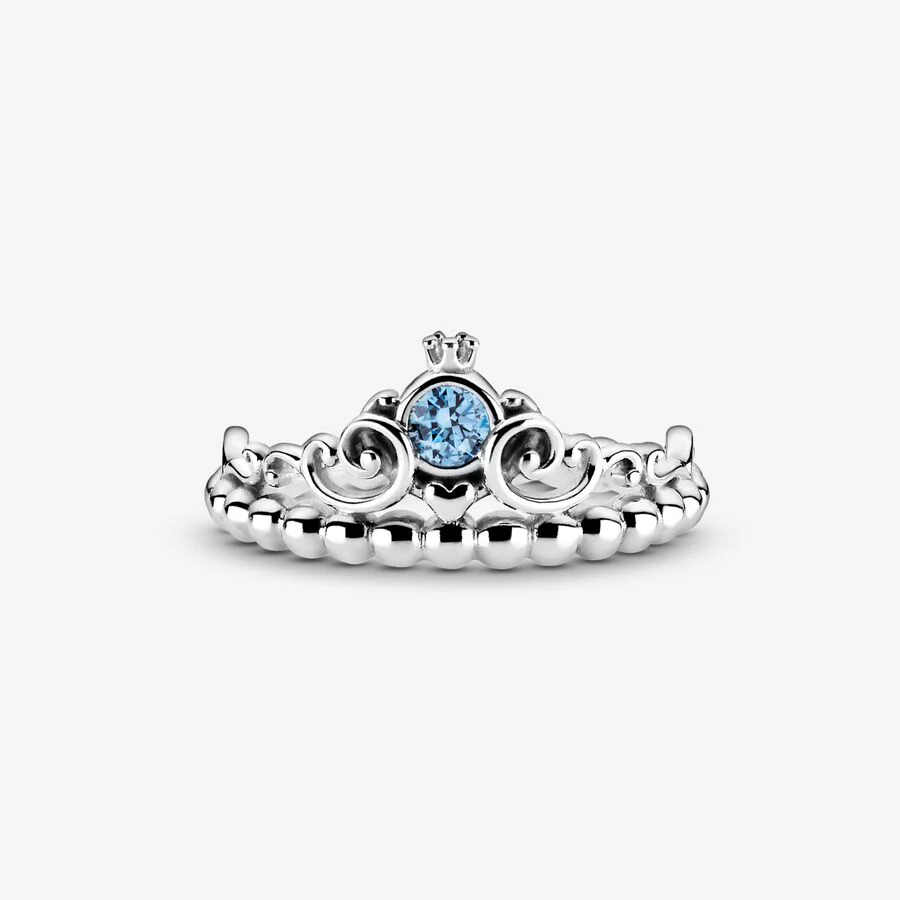 Prepárate para el baile con el Anillo Corona Azul de Cenicienta de Disney. Diseñado para celebrar el 70 aniversario de la Cenicienta de Disney, este anillo se presenta acabado a mano en plata de primera ley. Con forma de corona de princesa, este diseño calado incluye una gema azul central rodeada de remolinos simétricos y rematado con una corona en la parte superior y un corazón debajo. Una serie de esferas dan forma al eje del anillo. Combina esta joya con pendientes en plata de primera ley para crear un look mágico a juego.