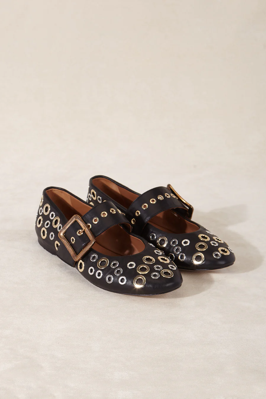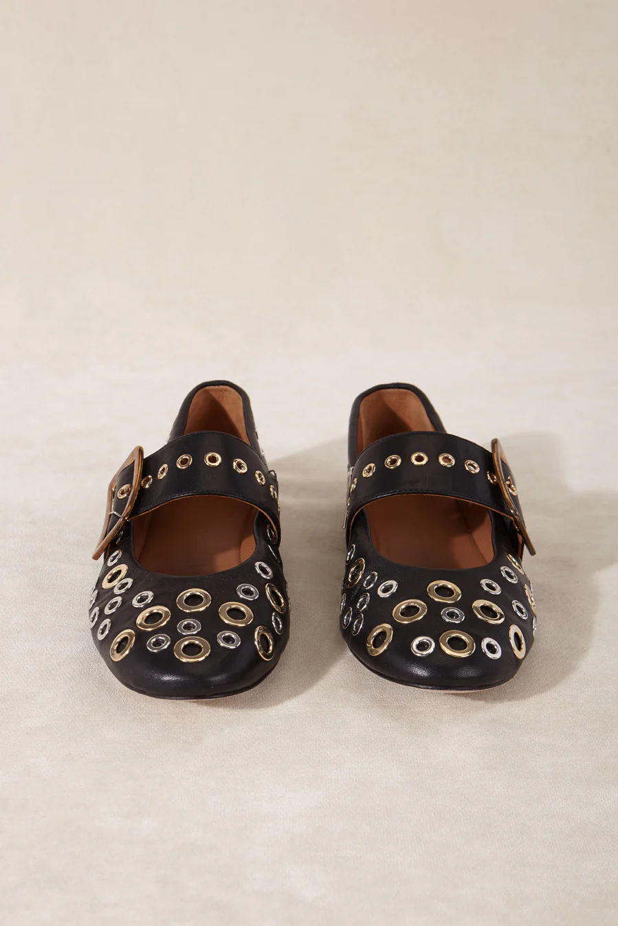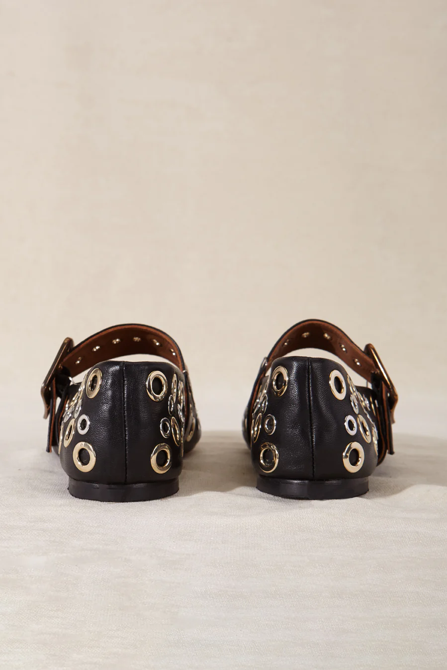 Bailarina de estilo merceditas efecto guante Barefoot en piel negra, el equilibrio perfecto entre tendencia y comodidad. Suela hiper flexible roll, puntera almendrada y escote redondo con un acabado premium. Detalles de eyelets combinando tamaño y tono que marcan la esencia Micuir. Tira en empeine de 3,5 cm de ancho con eyelets metálicos en tono dorado hipoalergénicos con cierre de hebilla regulable. Presenta piso de 1 cm de altura con plantilla de microgel para un mayor confort. Forro y plantilla de piel mestizo de cabra a tono y planta con certificado »handmade in Spain» con logo grabado a fuego. Incluye una bolsa de algodón. Diseñado y fabricado artesanalmente en España.