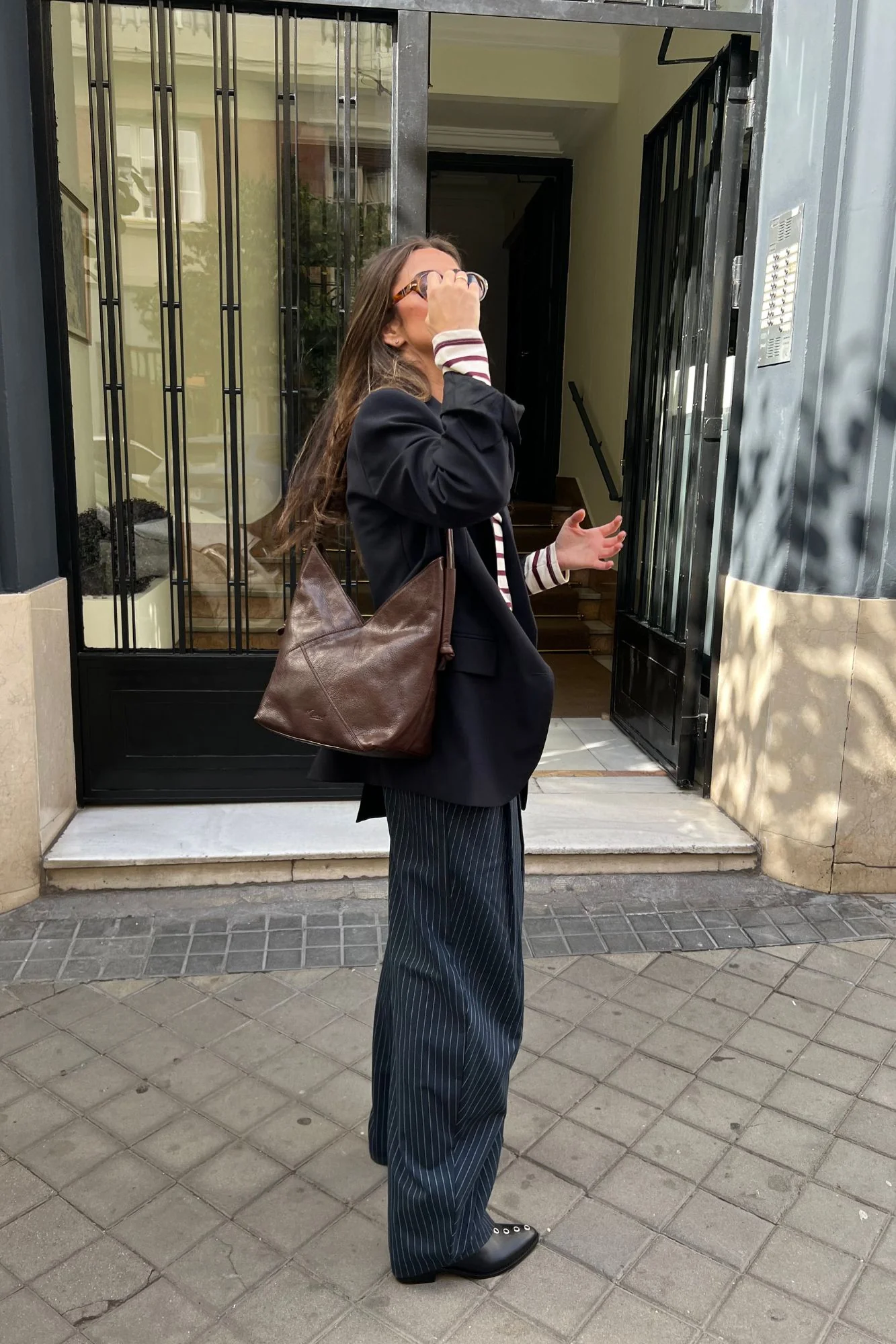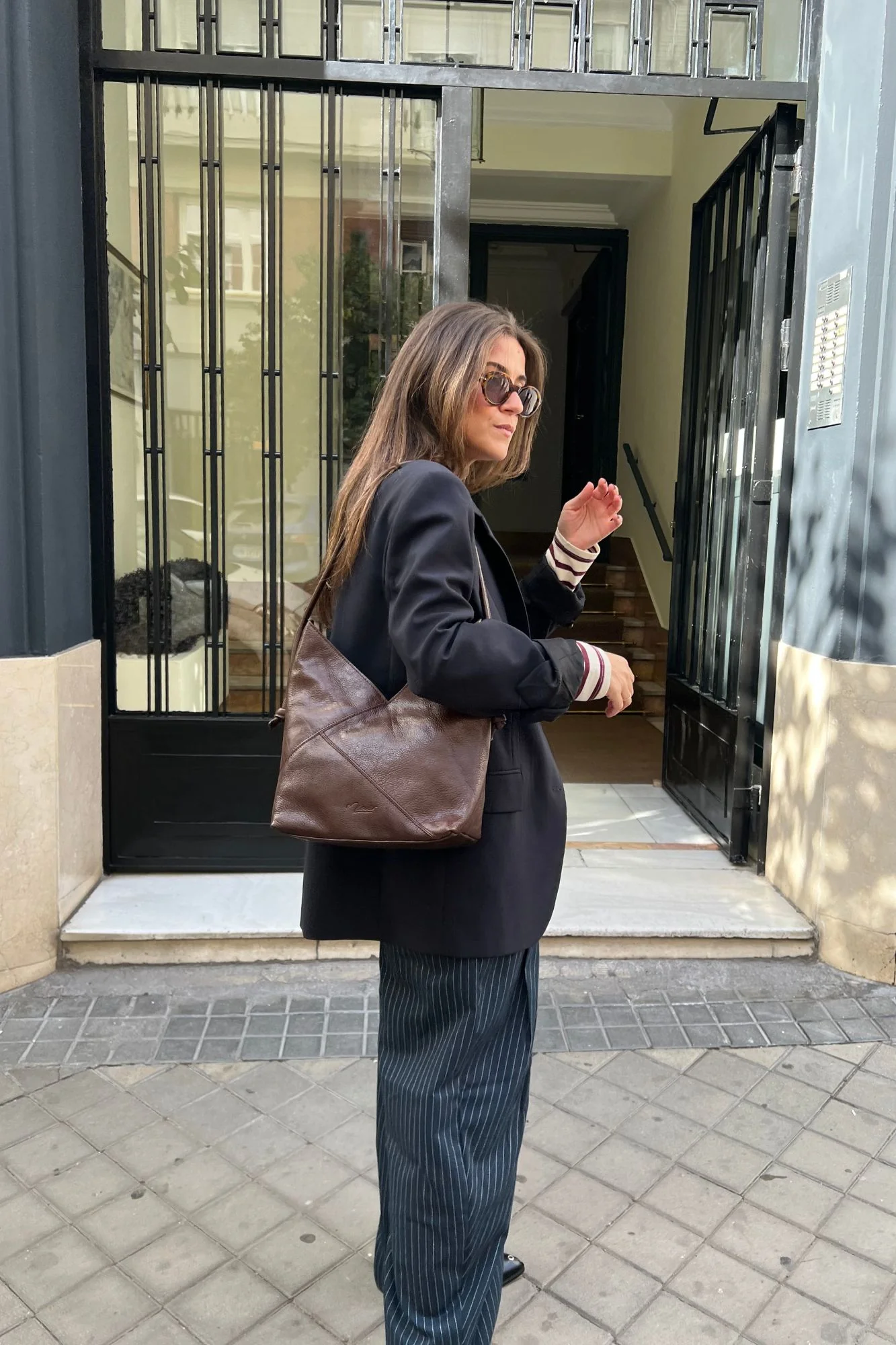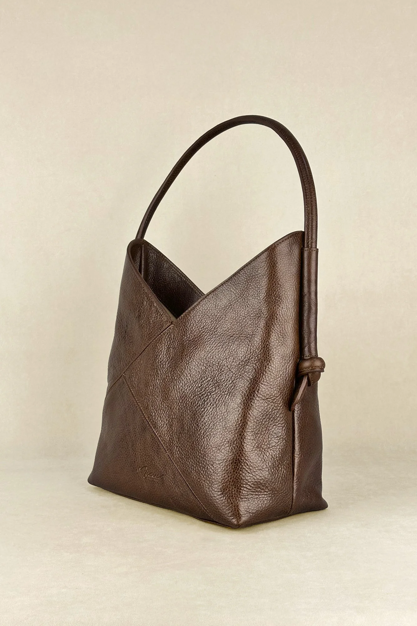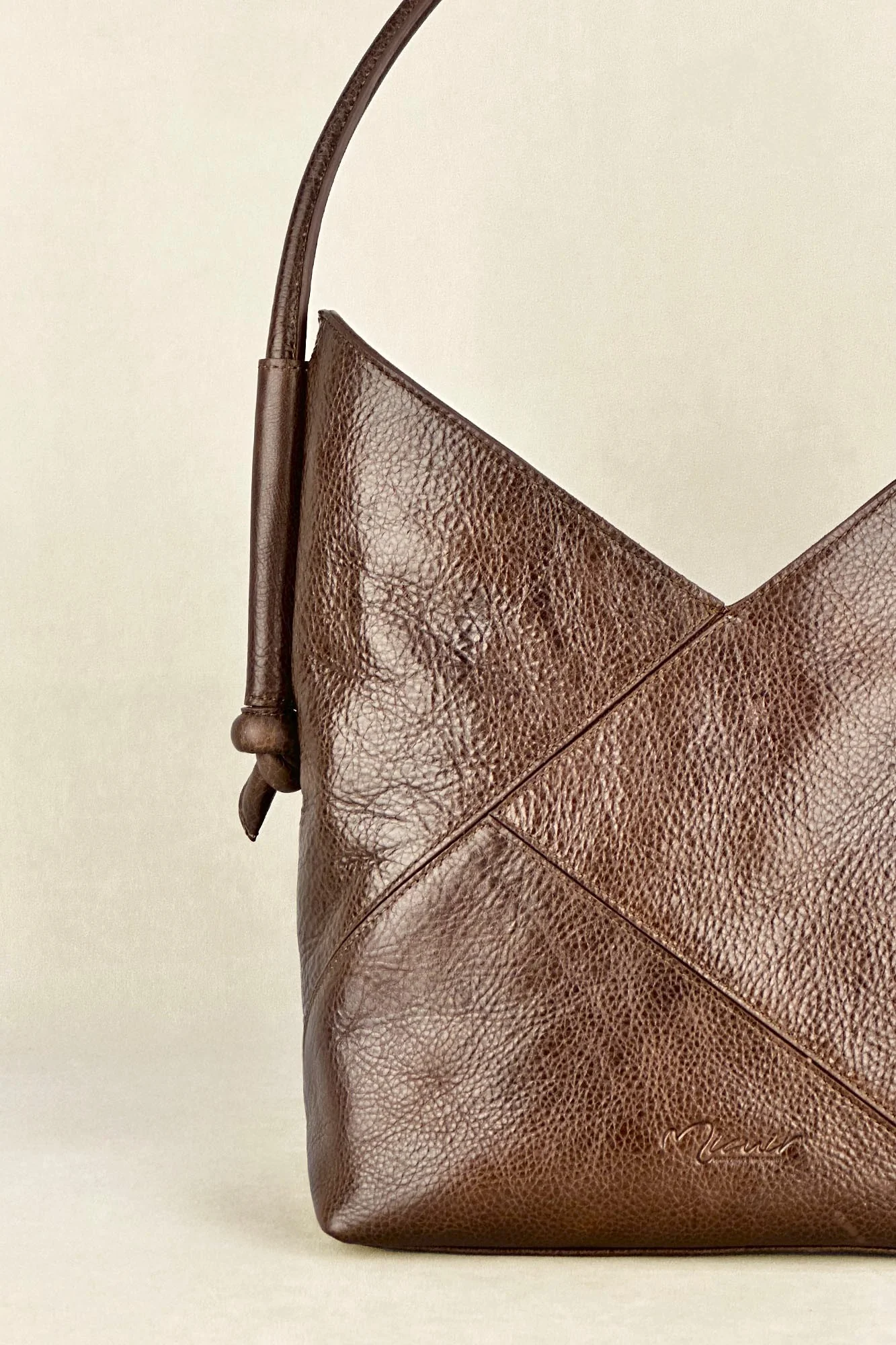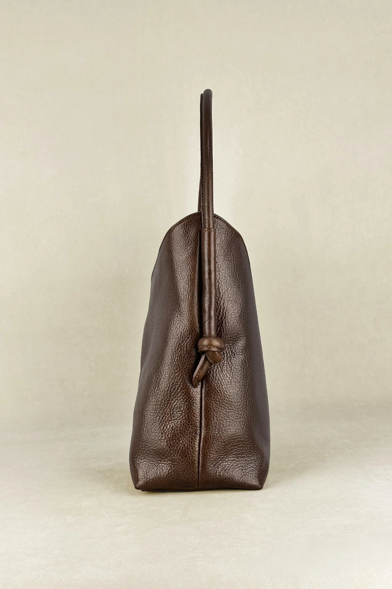 Bolso estilo shopper en piel suave de gran calidad en marrón chocolate. Diseño versátil y sofisticado, un modelo amplio con asa de hombro con detalle en lateral y costuras asimétricas. Cremallera metálica en su interior, forro de algodón a tono con bolsillo interior de cremallera. Acabado premium con cantos pintados a mano. Incluye una bolsa de algodón. Diseñado y fabricado artesanalmente en España.