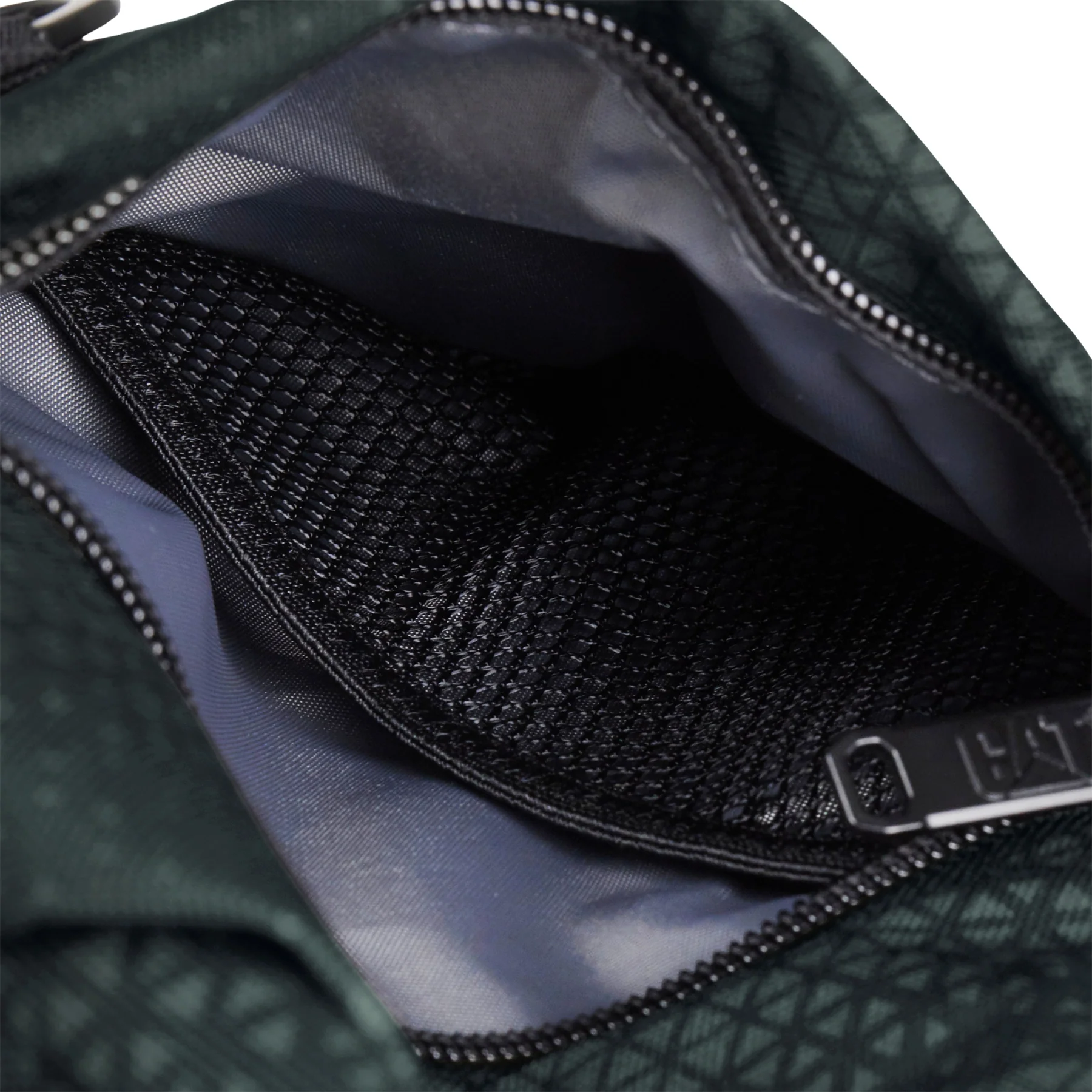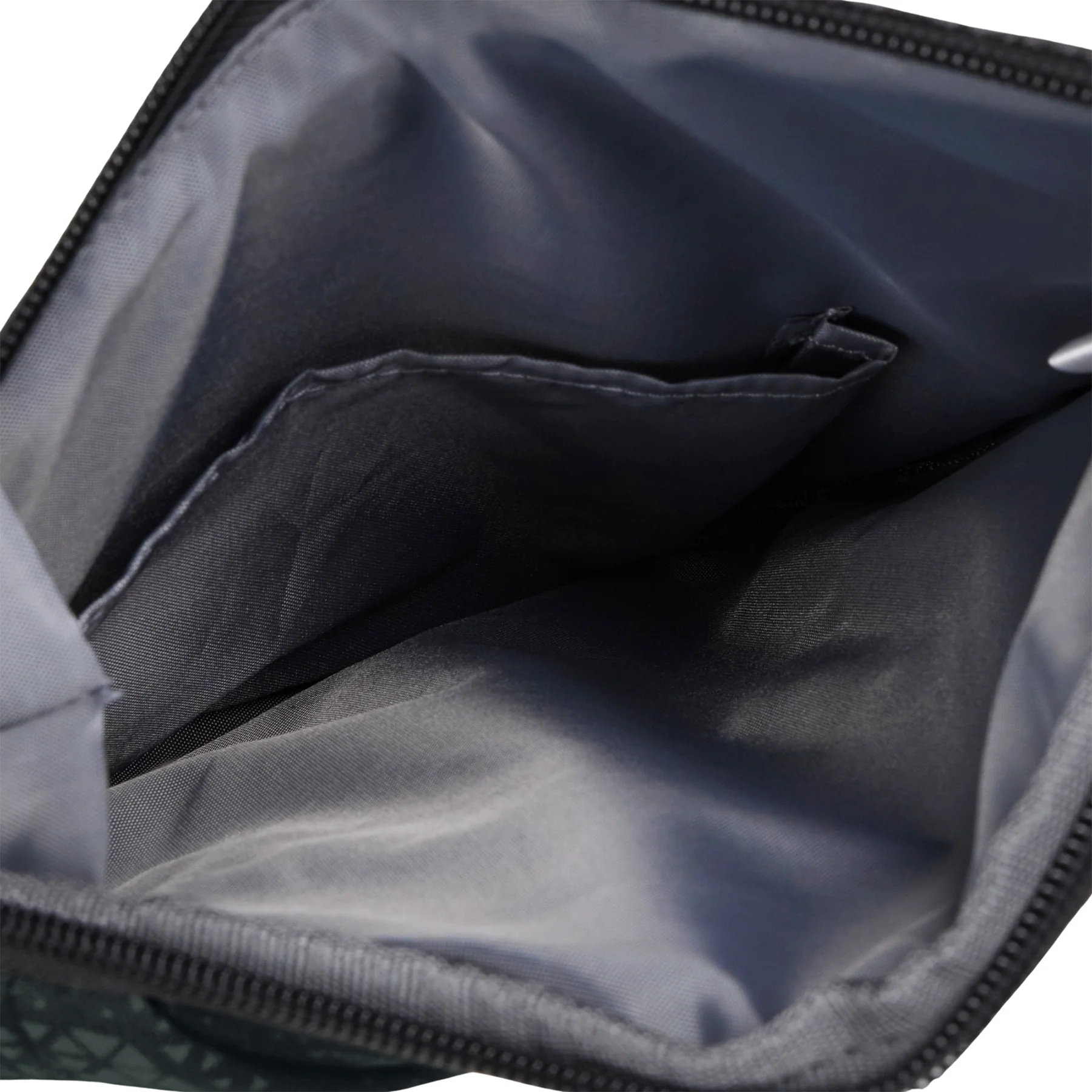 Bolso compacto con bolsillos con cierre al frente y en la parte trasera, bolsillo externo para teléfono con cierre de velcro y bolsillo interior tipo deslizante para mini tablet. Incluye una correa ajustable para el hombro con hebilla de liberación rápida en un extremo y hombrera acolchada con acceso rápido para tarjeta de metro. La correa también cuenta con una cinta adicional para sujetar gafas u otros objetos con clip. Fabricado en poliéster 600D de alta densidad (100%), con dimensiones de 30 x 6.4 x 24 cm, capacidad de 1 litro y peso de 0.23 kg.