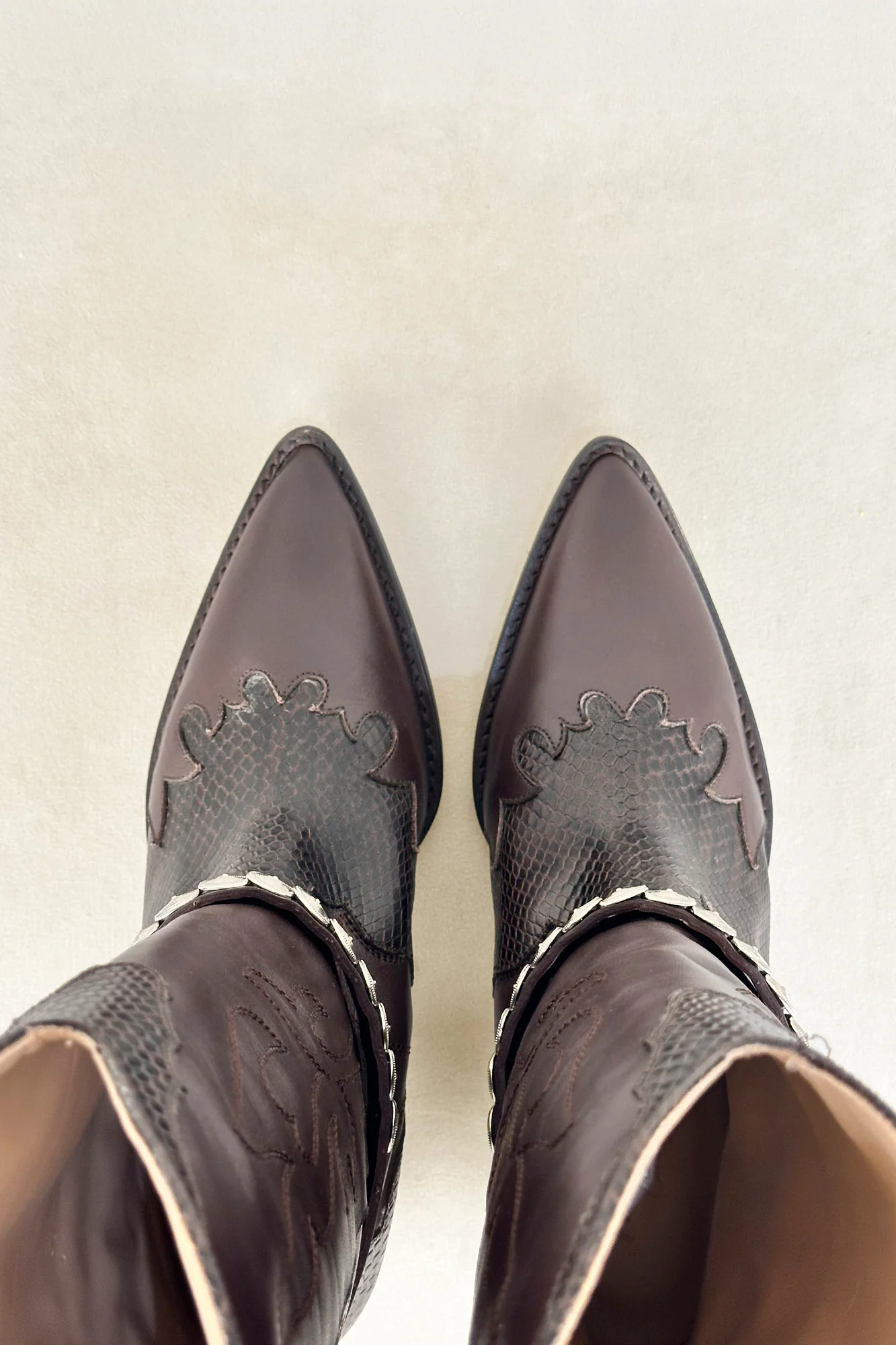 Bota de estilo cowboy botas de caña media en piel chocolate. Piezas en empeine, talón y parte superior en piel grabada snake a tono con bordados a tono en caña. Detalle de cadena con tachas únicas metálicas en plata. Presenta un tacón de 7 cm de altura con plantilla de micro gel para un mayor confort y tiras laterales de piel para mayor calce. Forro y plantilla de piel mestizo de cabra a tono y planta con certificado »Handmade in Spain» con logo grabado a fuego. Incluye una bolsa de algodón. Diseñado y fabricado artesanalmente en España.