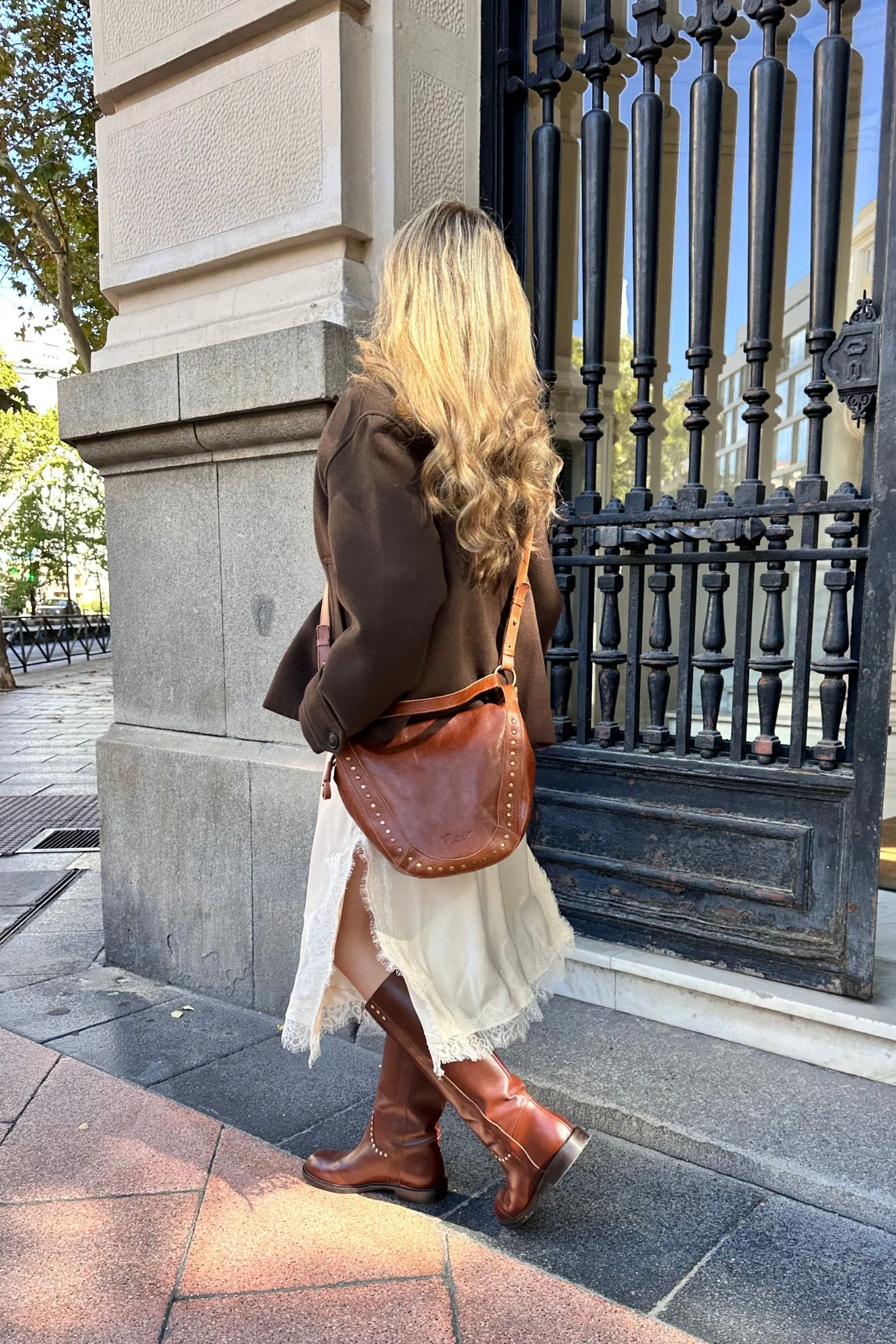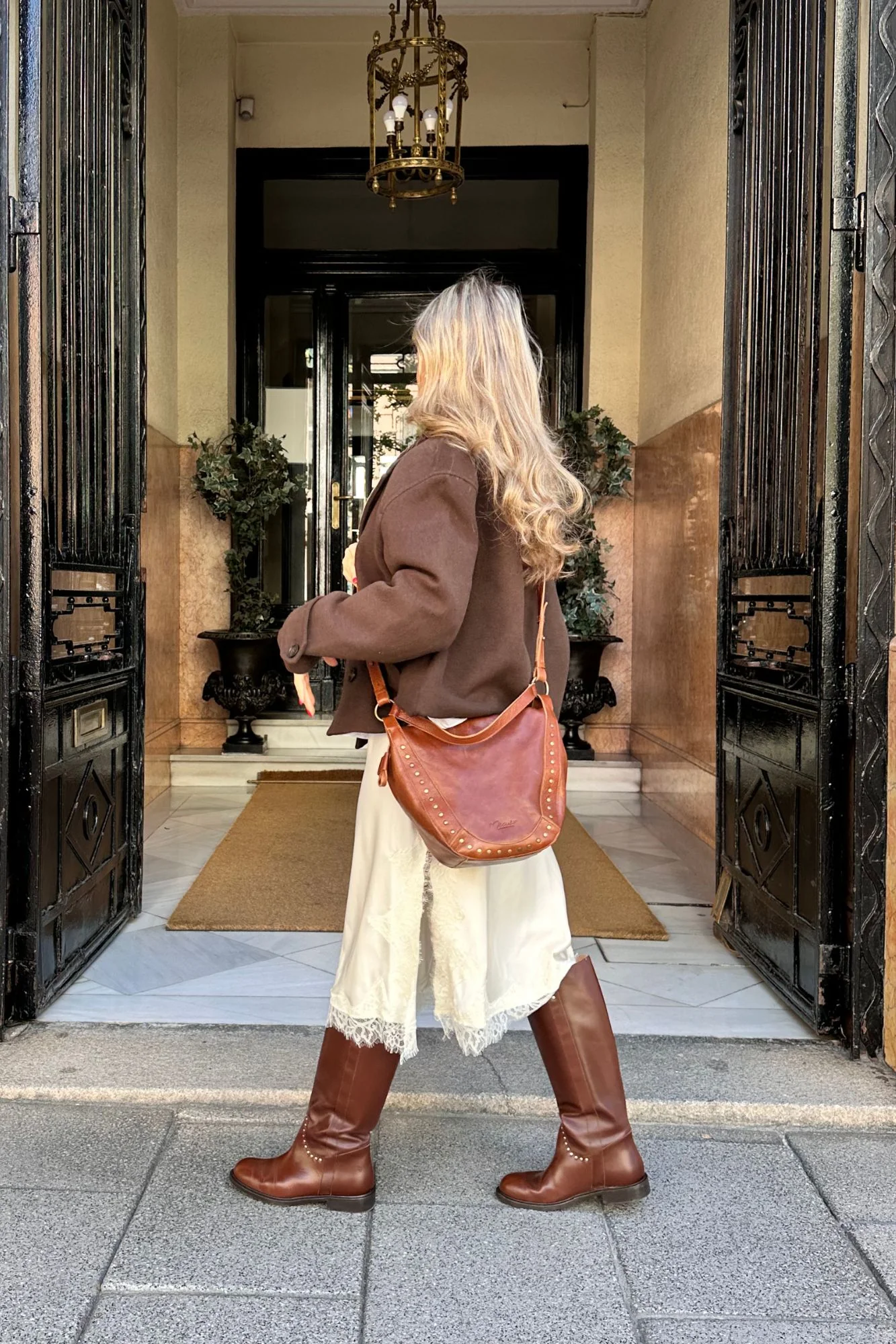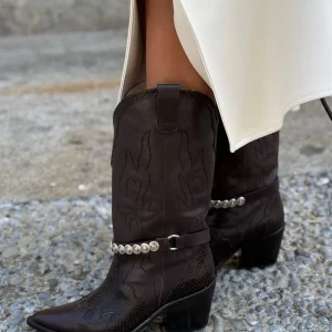 Bota de caña alta estilo ecuestre en piel marrón que combina su estilo atemporal y versátil. De puntera almendrada, caña ancha y tiras laterales con tachas metálicas en dorado en la parte superior y en corte de empeine que marca la esencia Micuir. Presenta un piso de 2 cm de altura con plantilla de micro gel para un mayor confort. Forro y plantilla de piel mestizo de cabra a tono y planta con certificado »handmade in Spain» con logo grabado a fuego. Incluye una bolsa de algodón. Diseñado y fabricado artesanalmente en España.