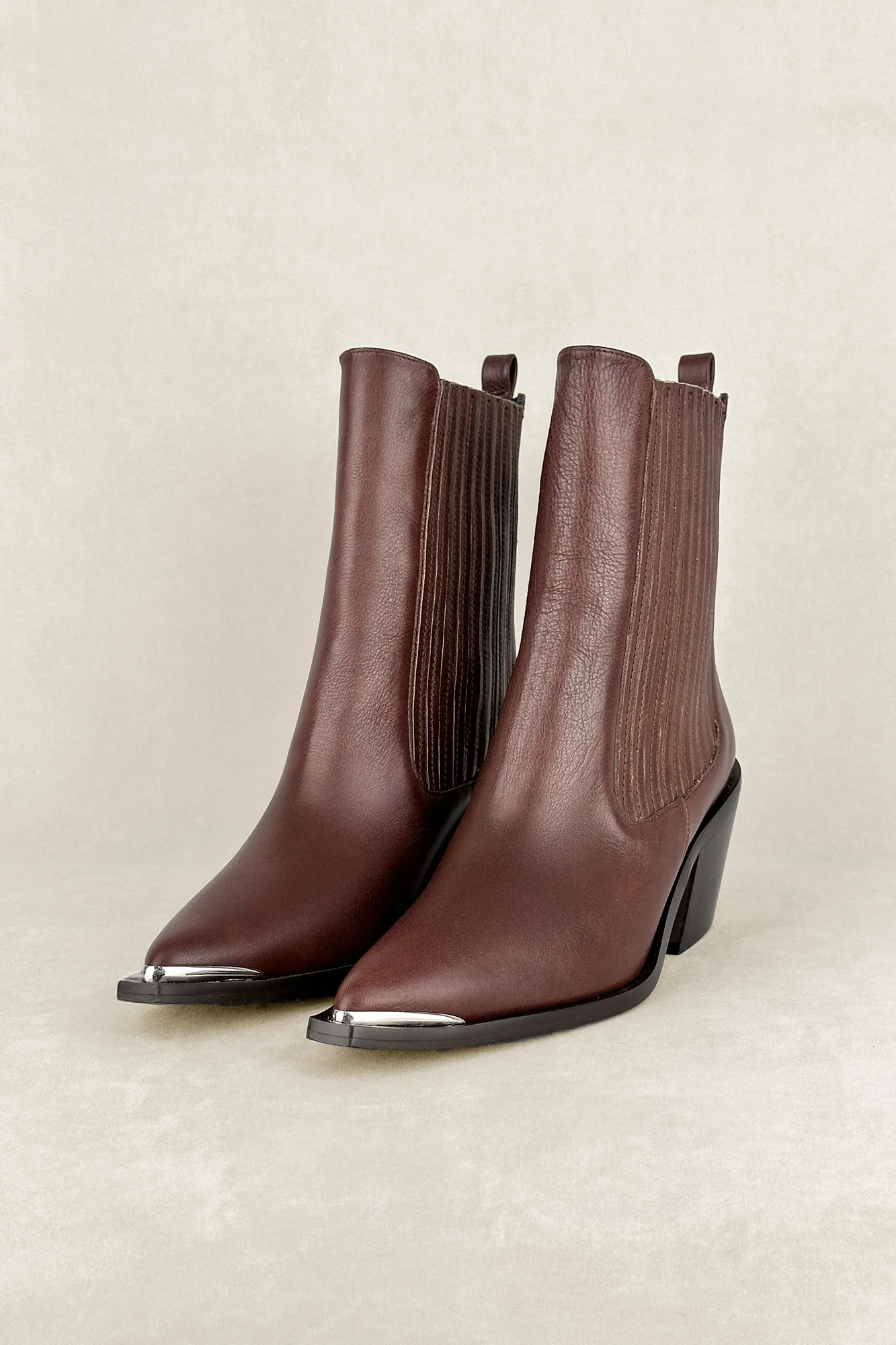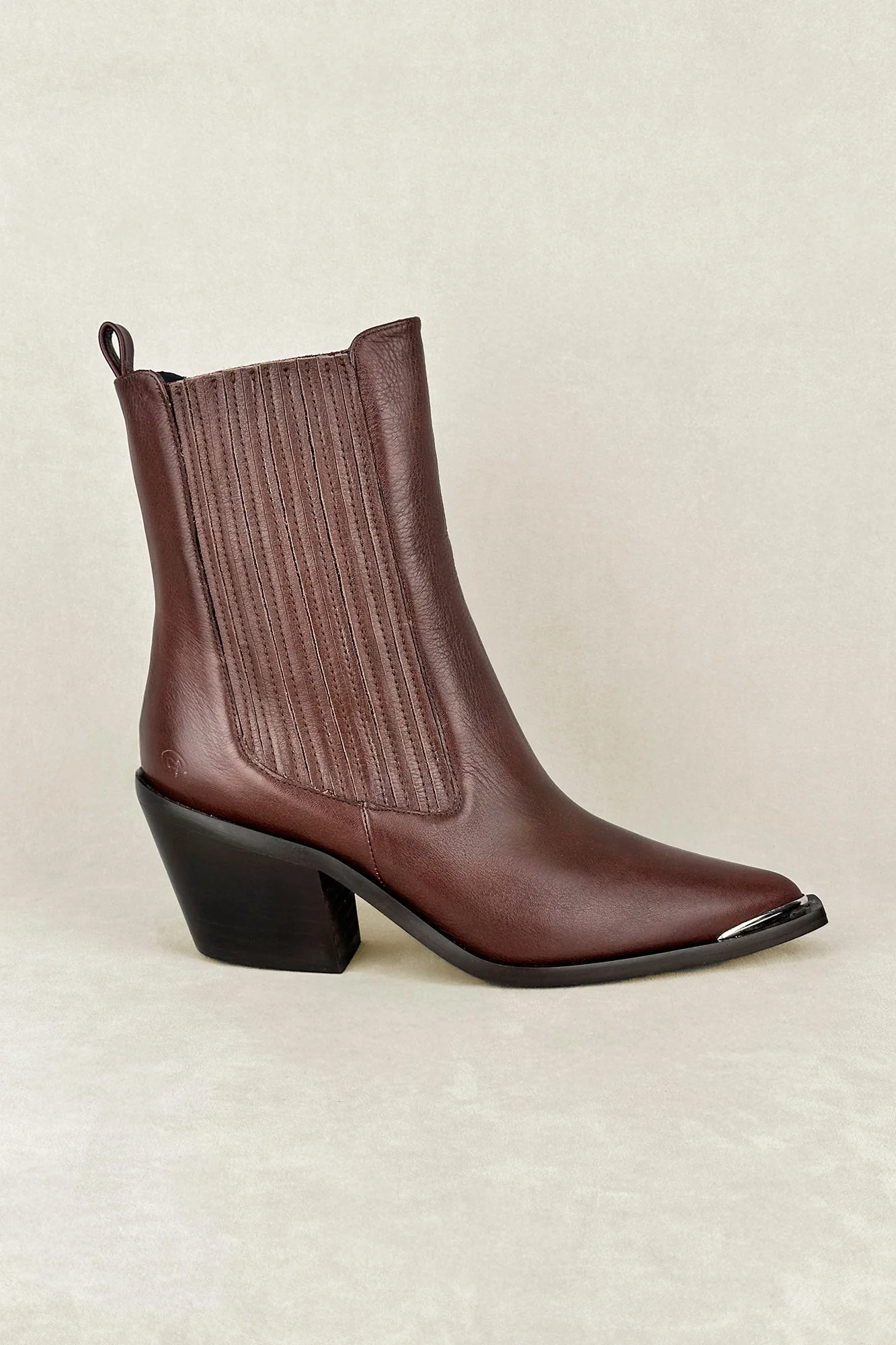Bota de caña media de estilo cowboy con puntera en piel premium marrón chocolate. Diseño de puntera con pieza metálica lo que marca el estilo único Micuir. Laterales de piezas elásticas a tono para mayor amplitud y trabilla de piel en parte superior para mejor calce. Presenta un tacón cubano de 7 cm de altura con plantilla de micro gel para un mayor confort. Forro y plantilla de piel mestizo de cabra a tono y planta con certificado »handmade in Spain» con logo grabado a fuego. Incluye una bolsa de algodón. Diseñado y fabricado artesanalmente en España.
