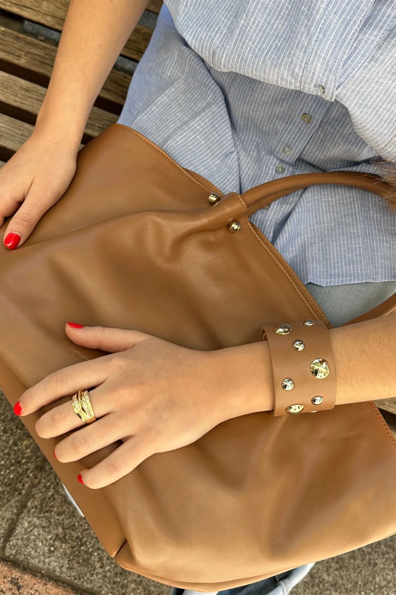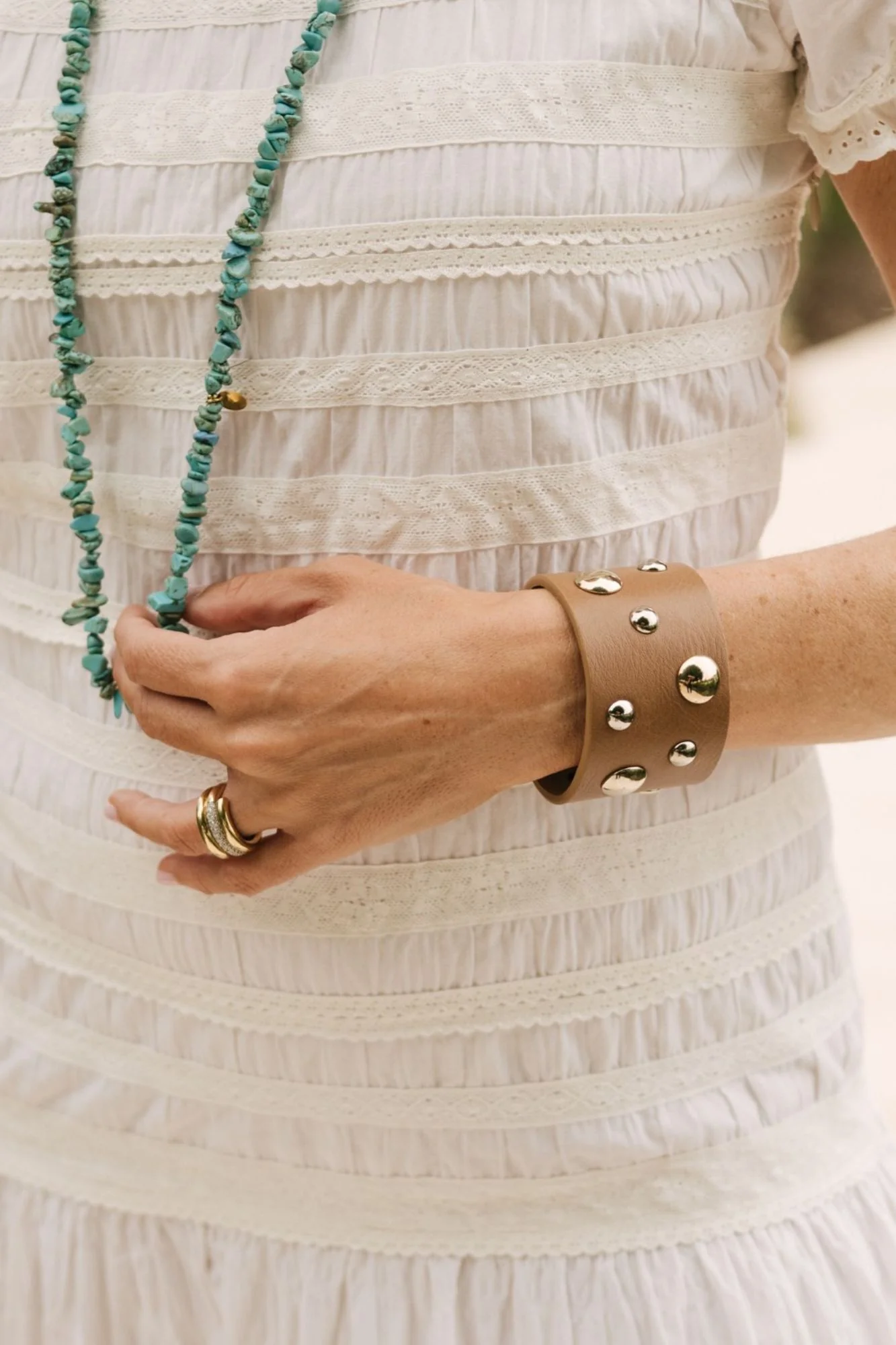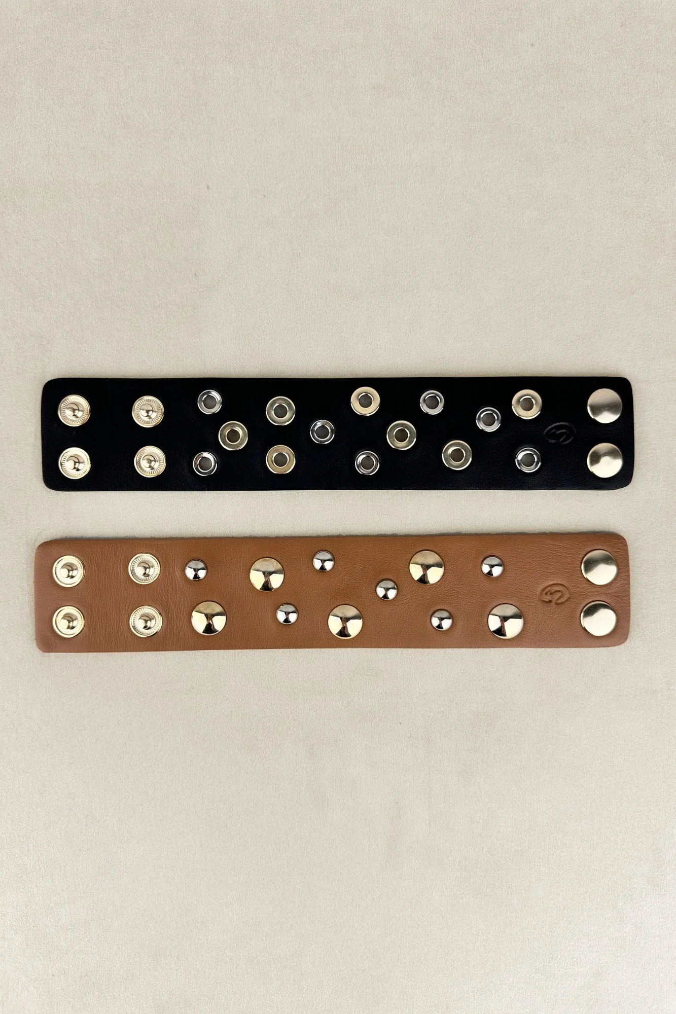 Brazalete Micuir con diseño exclusivo en piel color tostado. Tachas de media bola combinando diferentes tamaños y tono plata con dorado. Ancho de 4,5 cm con cierre de botón automático con dos medidas para que se ajuste lo mejor posible. Logo grabado a fuego, hecho por nuestros artesanos en España.