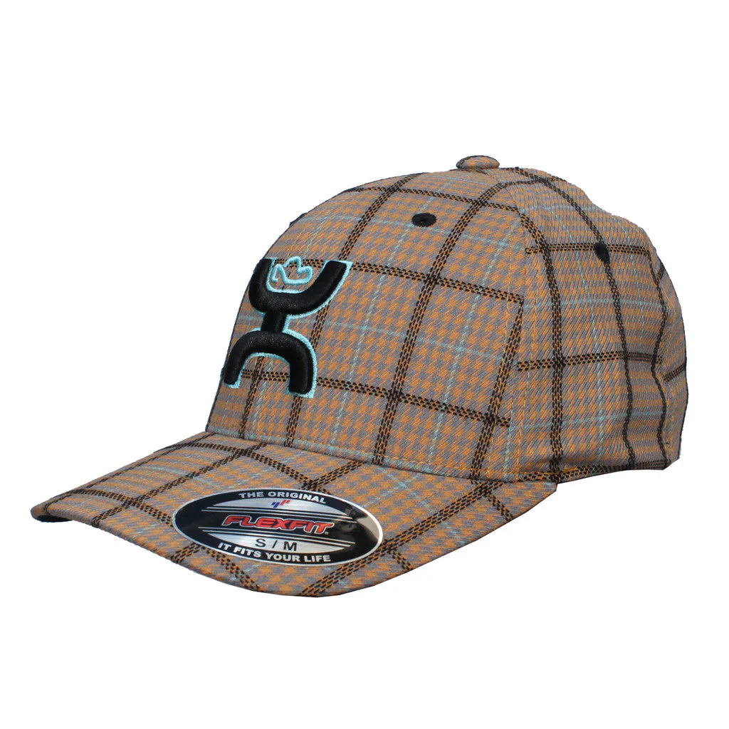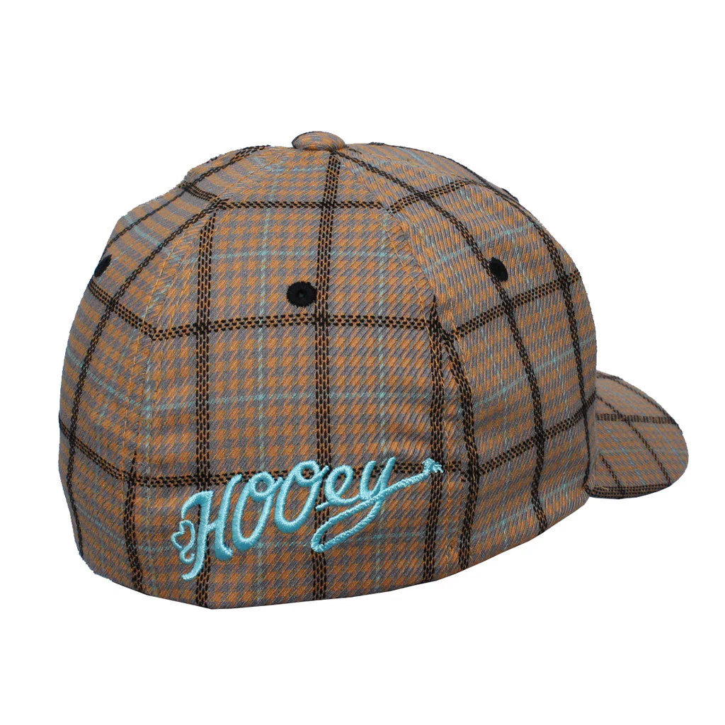 Cachucha HOoey Roca Catalina color beige con diseno a cuadros en turquesa y negro, logo «HOoey» al frente en fondo negro con contorno turquesa
