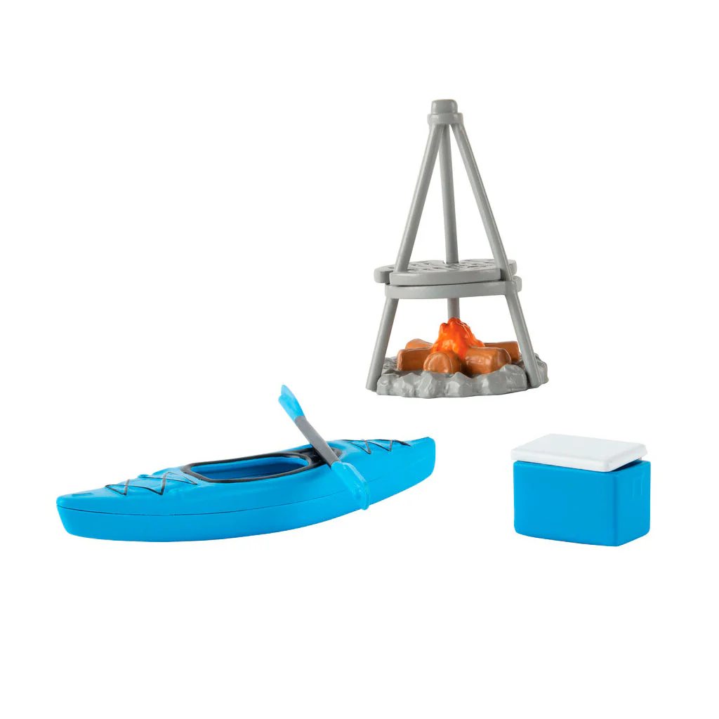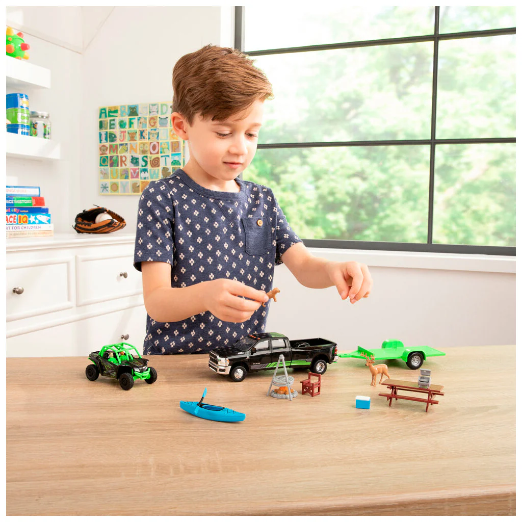 - Juego de juguetes de aventura todoterreno: el juego de 15 piezas incluye camioneta Dodge Ram, Wildcat Side by Side, remolque, canoa, animales de juguete, campistas y equipo de campamento
