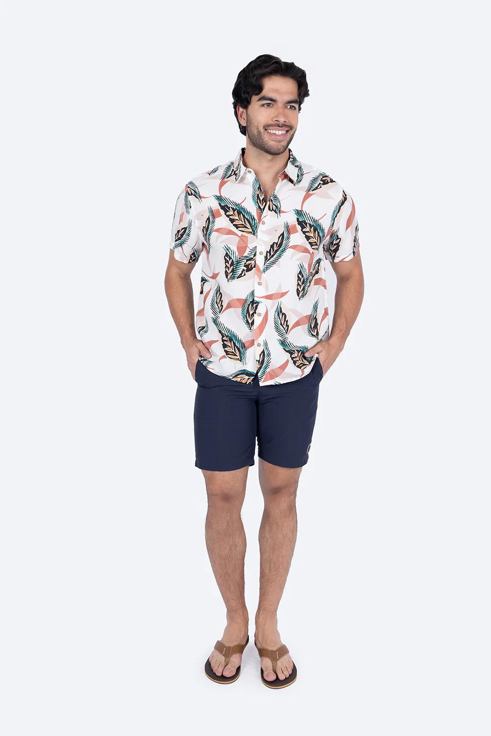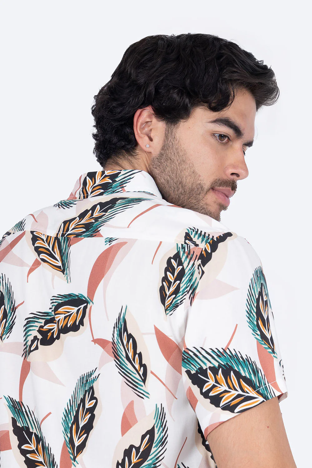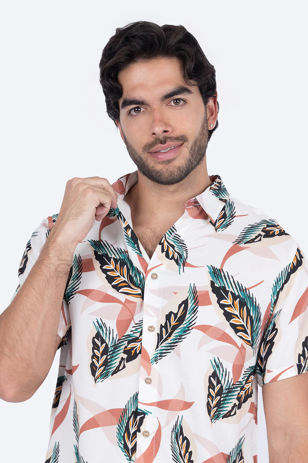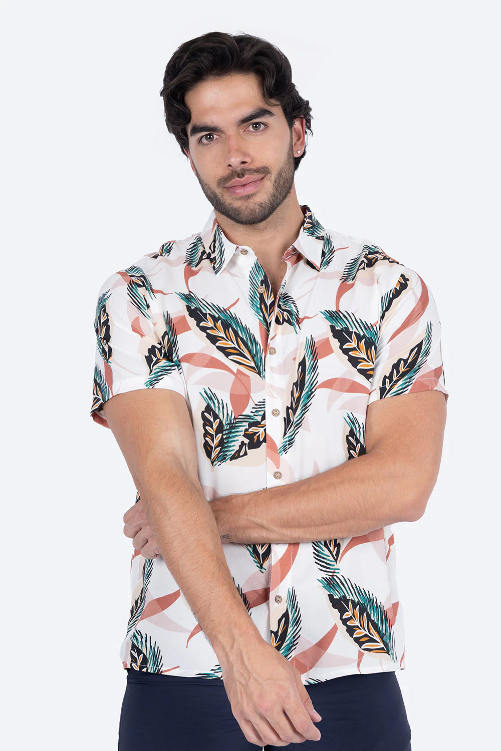 Camisa manga corta confeccionada en 100% viscosa de alta calidad. Presenta un elegante fondo beige claro complementado con un sofisticado estampado de hojas en tonos cálidos. Su composición garantiza una excelente transpirabilidad y caída fluida, ideal para un estilo casual-elegante en climas cálidos.