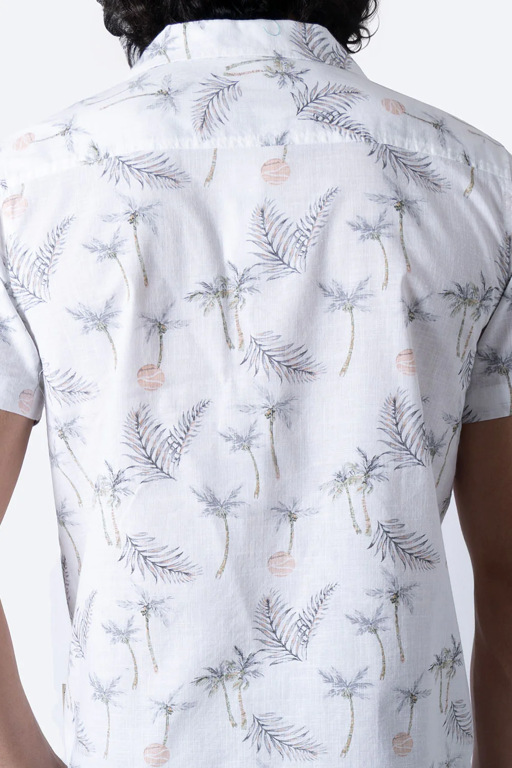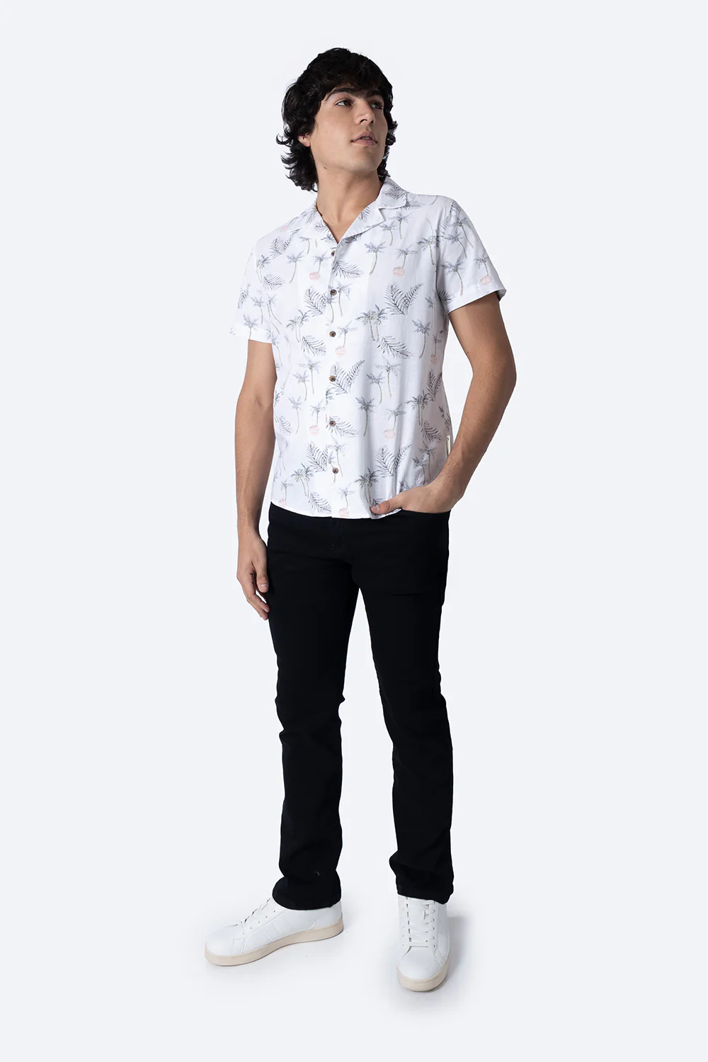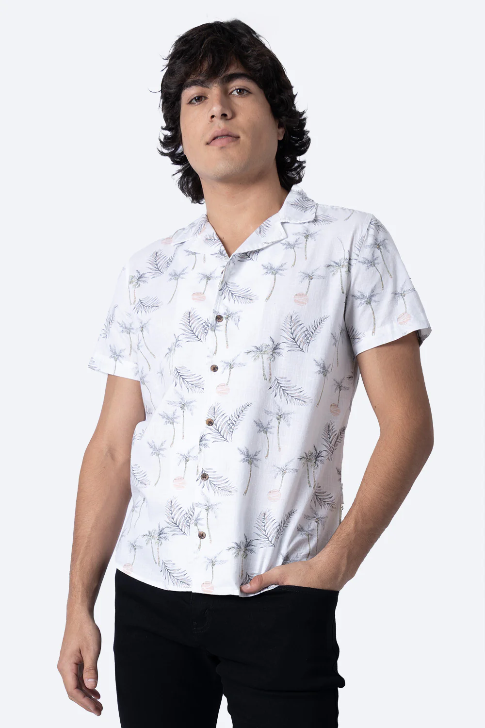 Esta camisa blanca de manga corta presenta un diseño casual de palmeras en tono verde y gris, confeccionada en 100% algodón para garantizar comodidad y transpirabilidad. Ideal para quienes buscan un estilo fresco y cómodo, combina calidad y un estampado distintivo que realza cualquier atuendo casual.