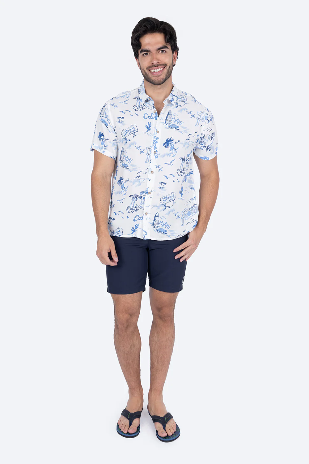 Camisa manga corta confeccionada en 100% viscosa de alta calidad. Presenta un elegante fondo blanco complementado con un sofisticado estampado de palmeras en tonos azules. Su composición garantiza una excelente transpirabilidad y caída fluida, ideal para un estilo casual-elegante en climas cálidos.