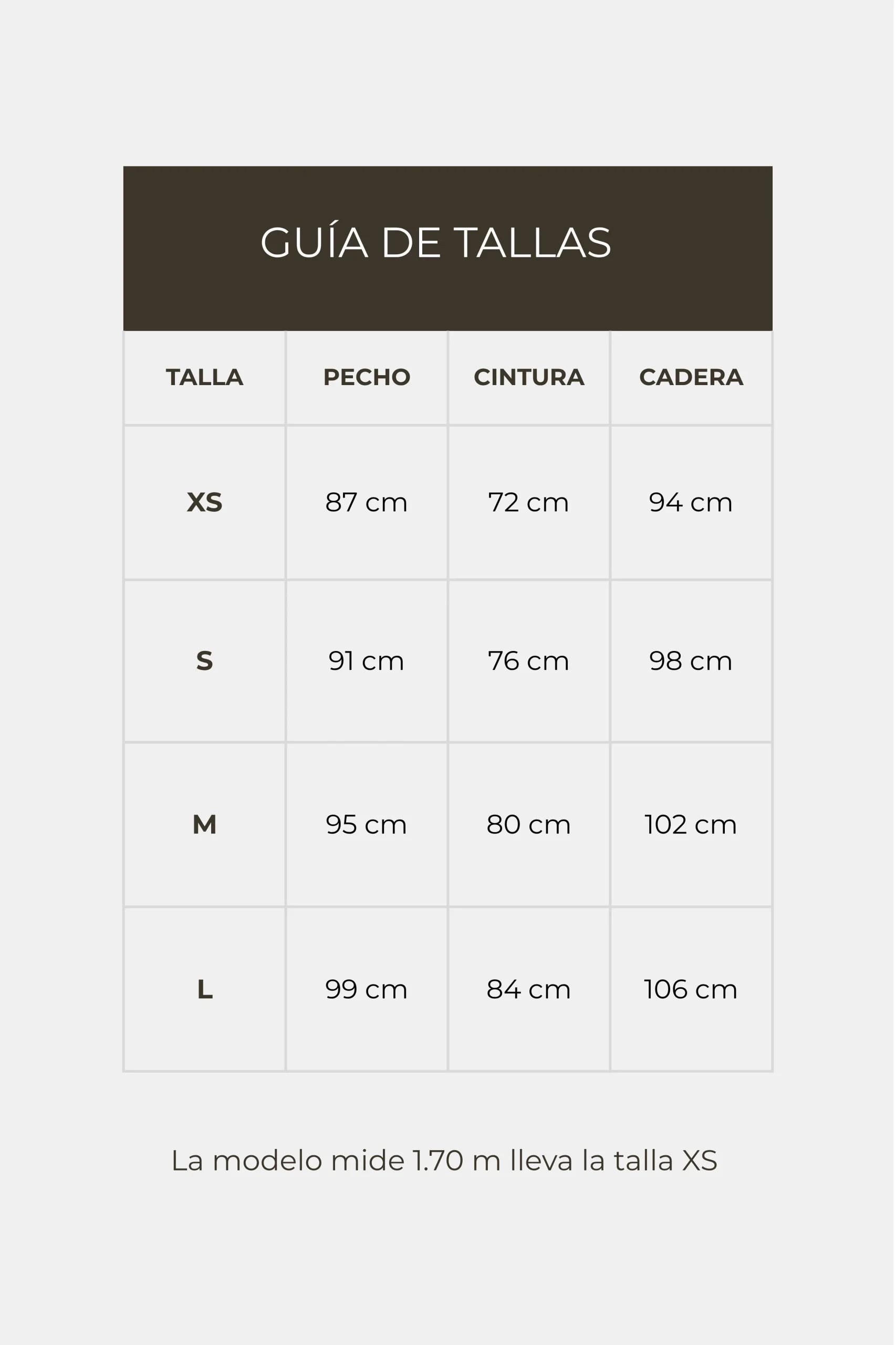 La modelo mide 1’70 cm y lleva la talla XS. Puedes consultar nuestra guía de tallas ante cualquier duda.