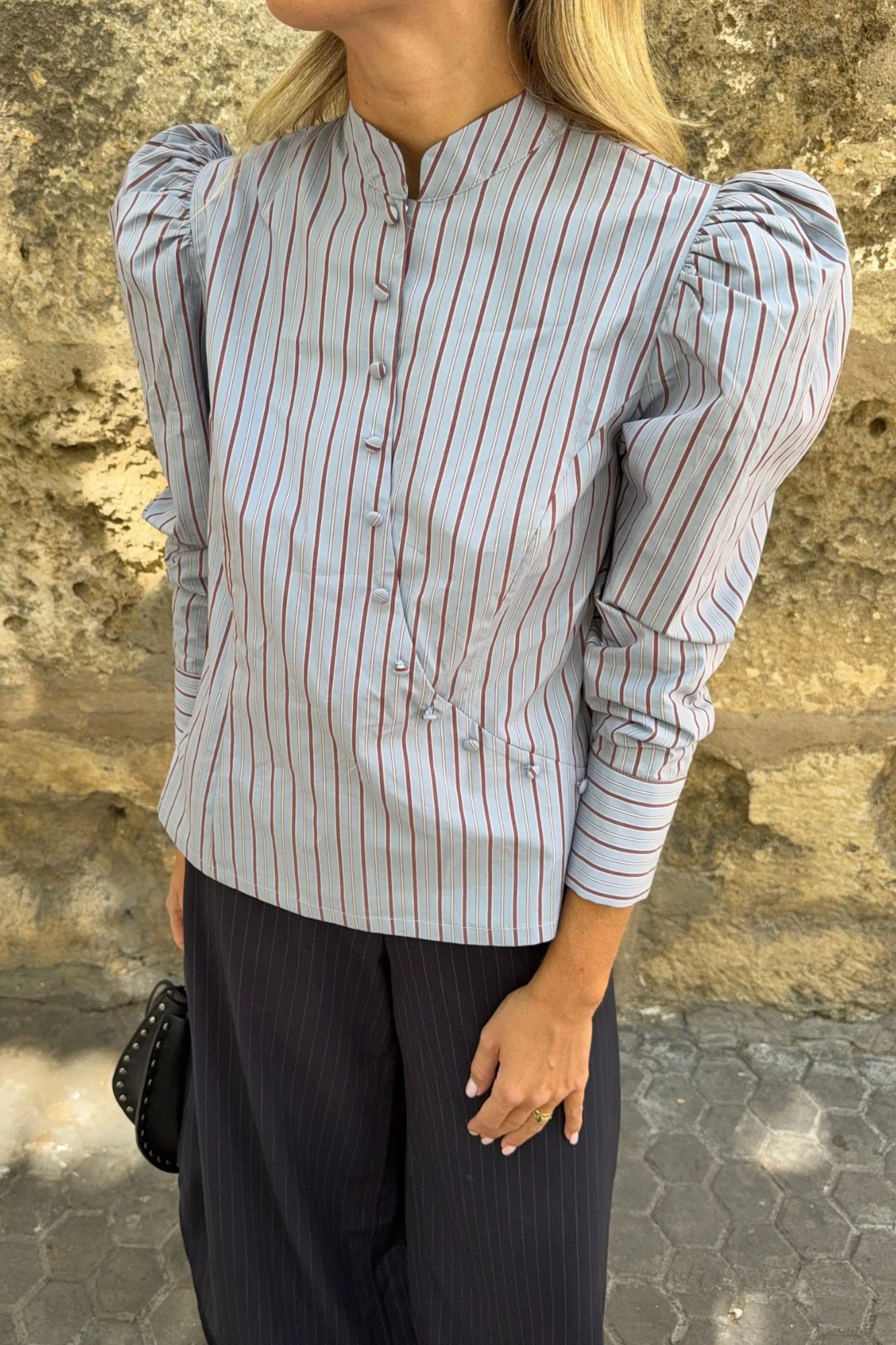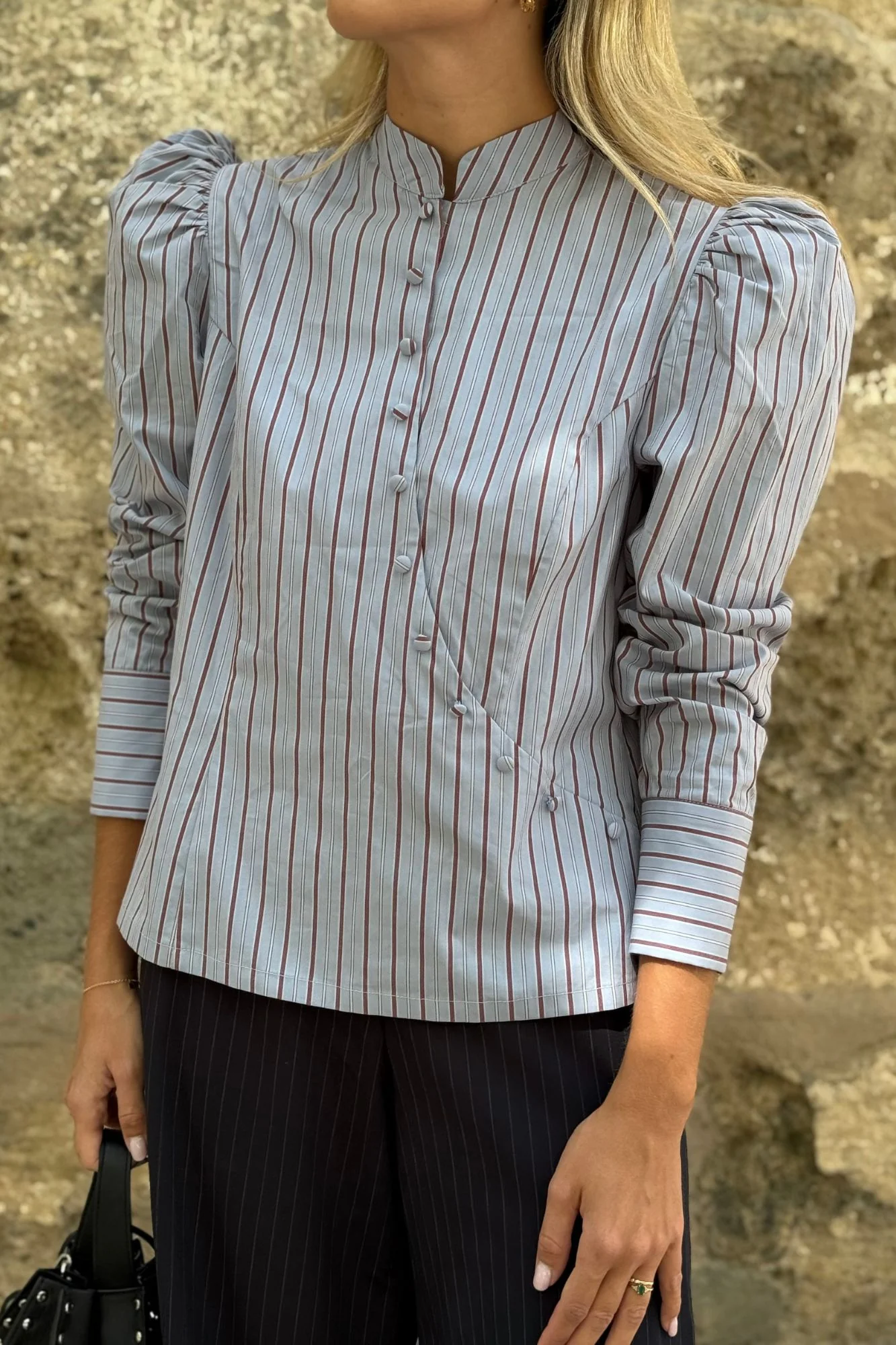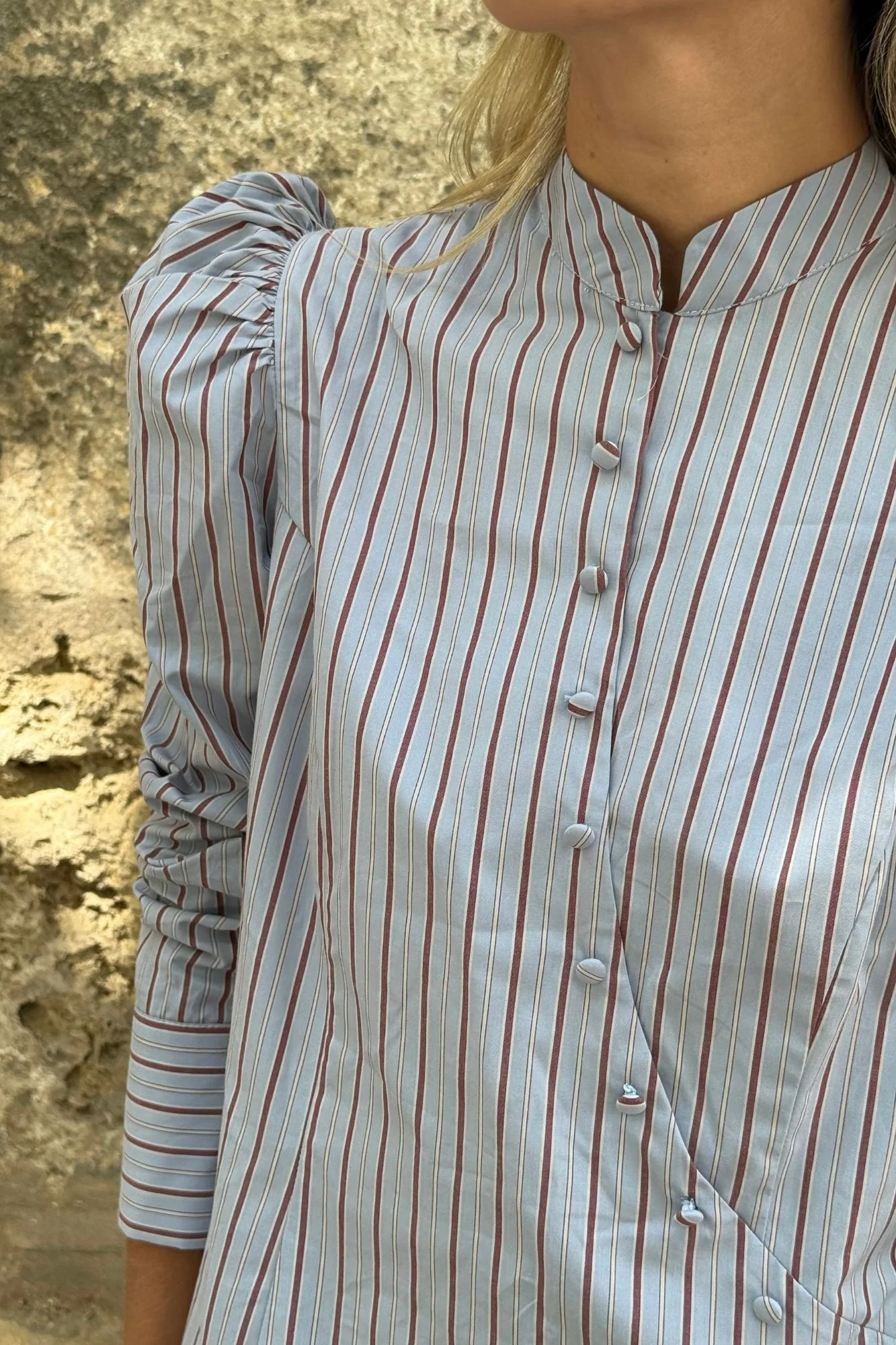 Camisa de diseño único en algodón de calidad premium con estampado de rayas en tonos azul y burdeos. De cuello mao y cruce delantero asimétrico estilo japonés con pequeños botones forrados en detalle. Cierre frontal de botones interiores automáticos para mayor comodidad y cremallera lateral invisible. Manga larga ligeramente abullonada con puño ancho y botones nácar en parte exterior.
