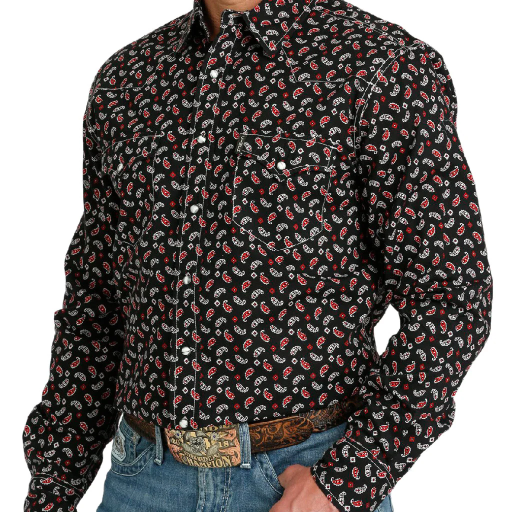 - Camisa negra, con estampados en rojo y blanco