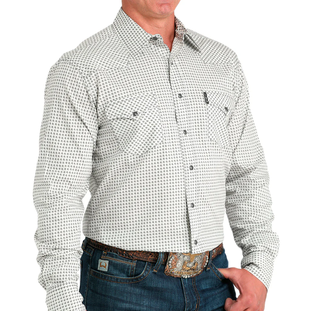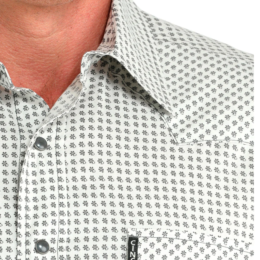 Realza cada movimiento con un elegante tejido liso de algodón Western color crema Modern Fit, confeccionado por CINCH. Esta prenda vaquera imprescindible presenta un denso estampado floral integral con pespuntes en contraste, dos bolsillos delanteros, canesú, logotipo bordado y broches de presión grises