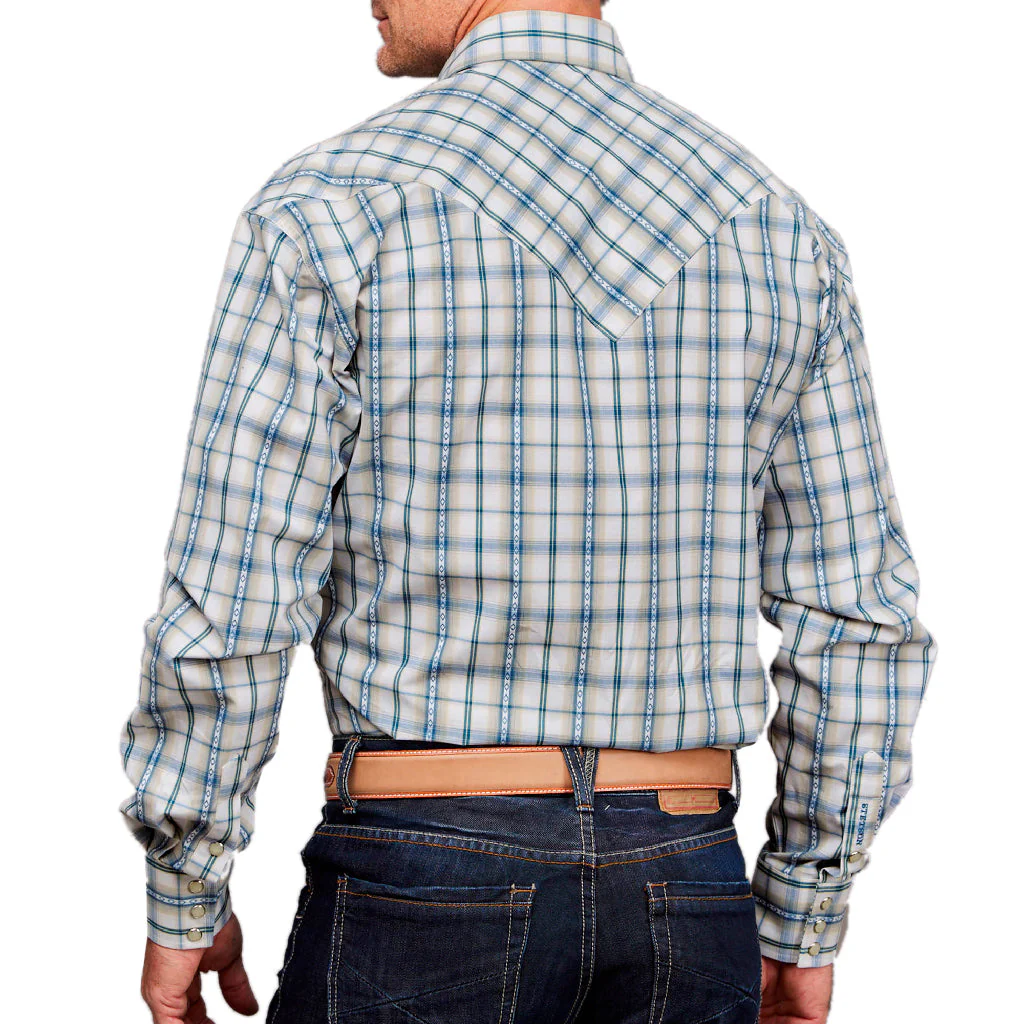 - Camisa Stetson color beige y estampado de cuadros con franjas en varios tipos de azul