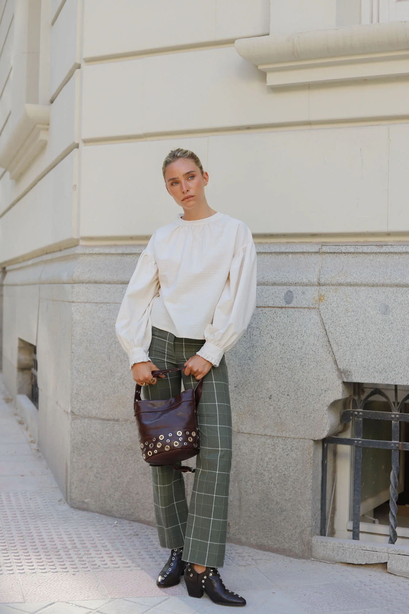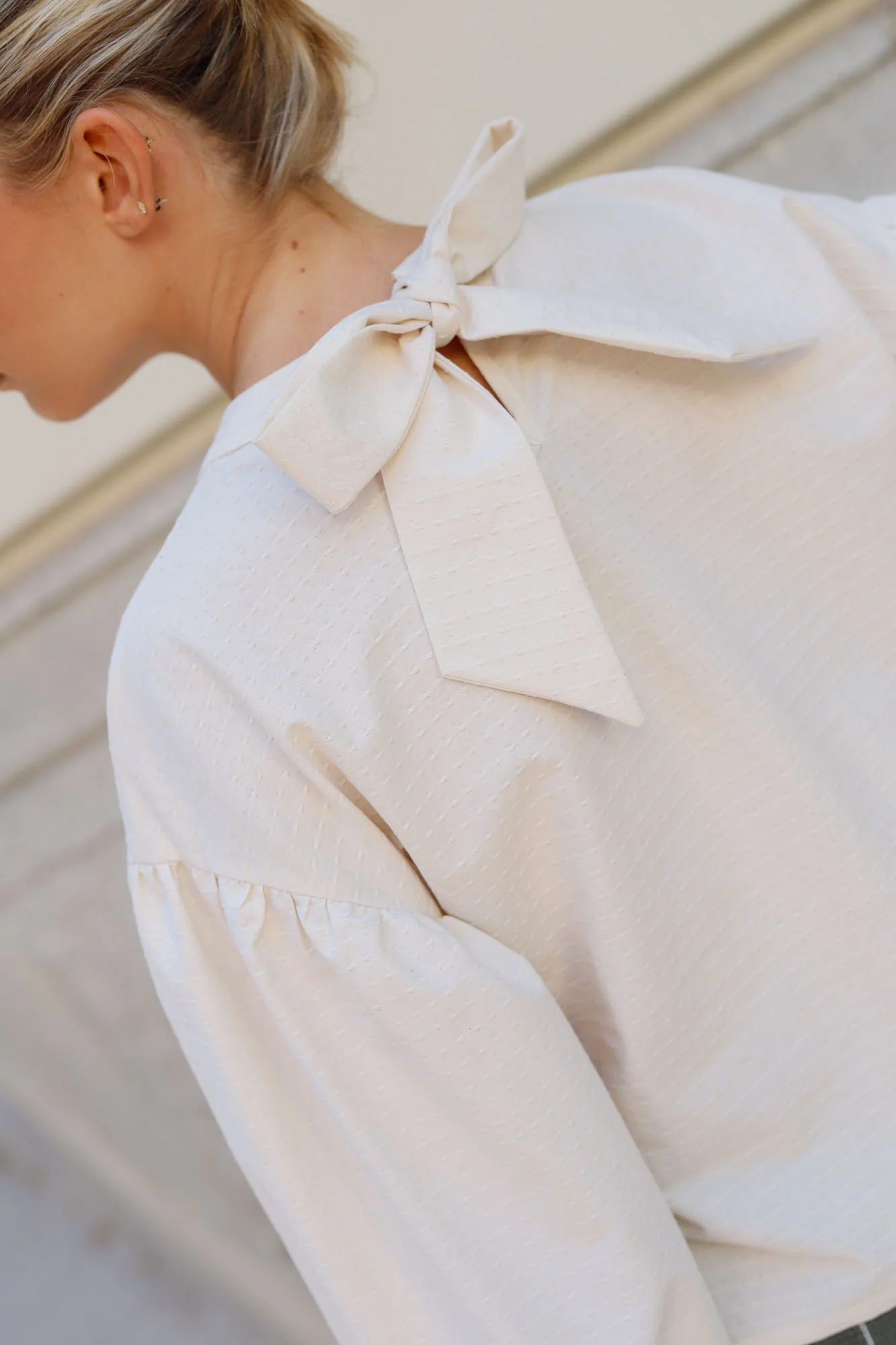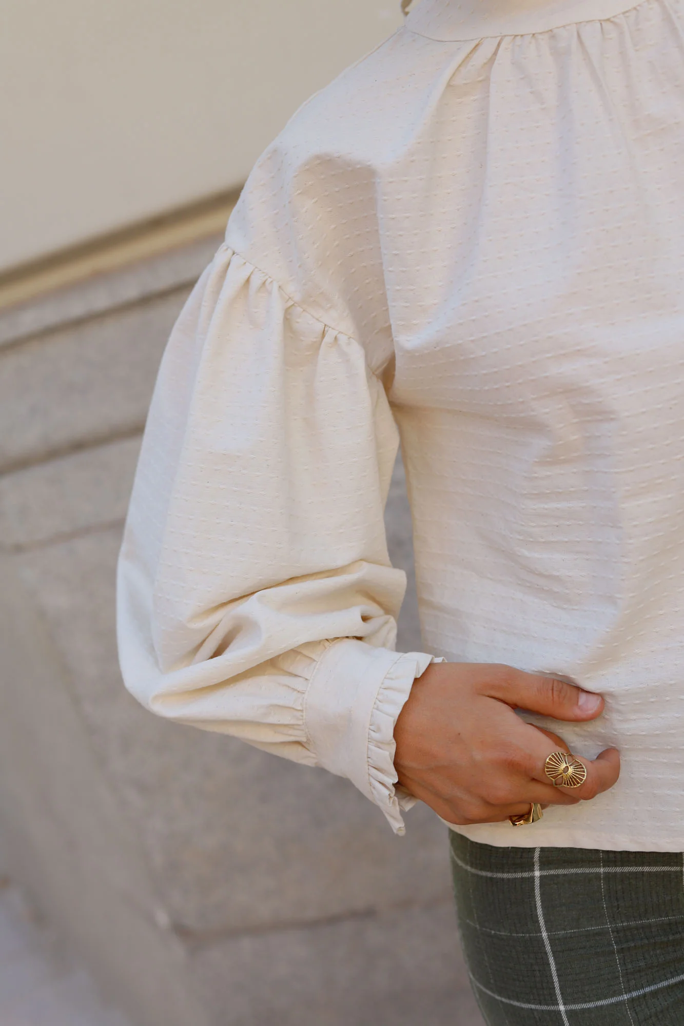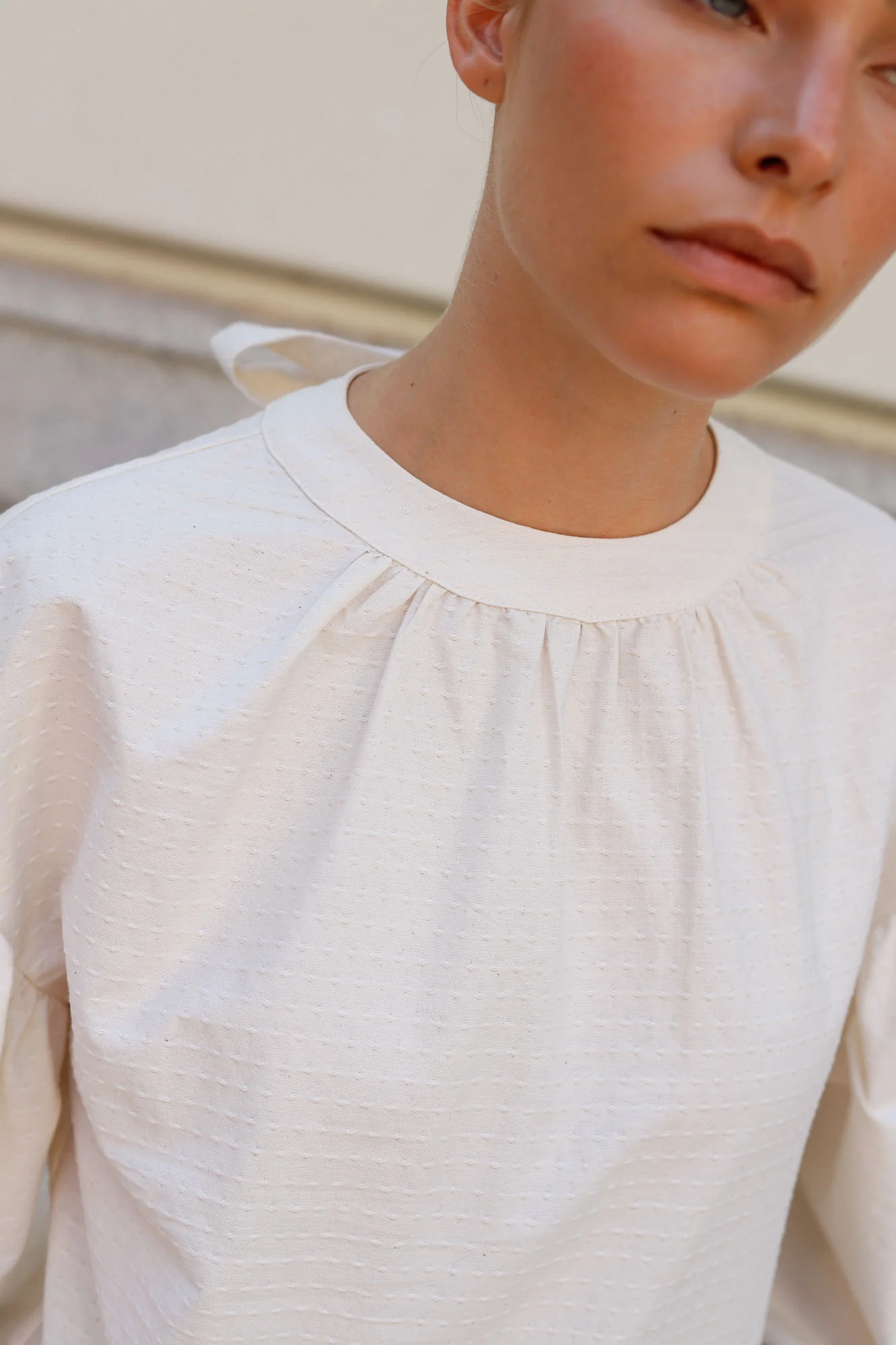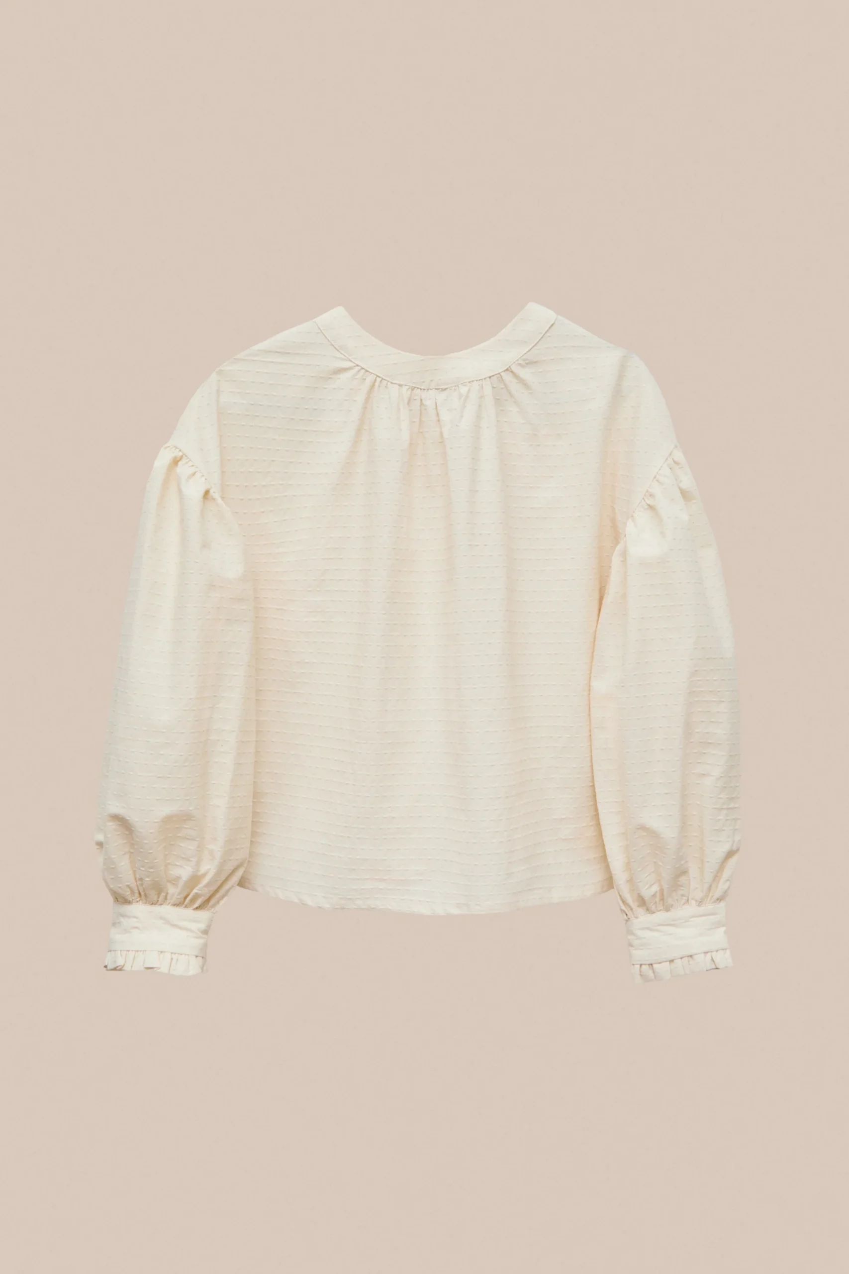 Camisa de diseño único en algodón de calidad premium en color crudo con detalle de textura con puntitos. Escote redondo con fruncido con lazada amplia en parte trasera. Manga larga con volumen abullonada y puño amplio con pequeños volantes y detalle de botones de nácar.