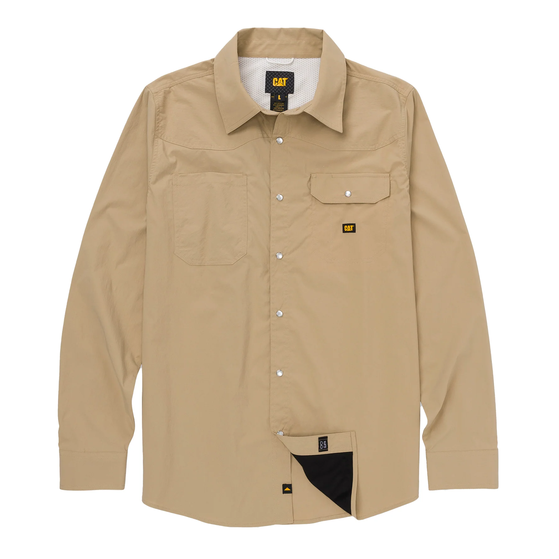 Cuenta con doble ventilación en la parte posterior del yugo con inserción de malla para mejorar la respirabilidad y controlar la temperatura. Es de secado rápido, sin enganches y antimicrobiano, con ventilación en las axilas. Dispone de dos bolsillos en el pecho frontal, uno de ellos con solapa estilo occidental con espacio para bolígrafos o gafas. Incluye un paño de microfibra oculto dentro del pliegue frontal, puños ajustables con cierre a presión y botones, y botones de presión estilo perla en la parte frontal. Con un 6% de elasticidad para un confort superior, lleva etiqueta con logo en el bolsillo izquierdo del pecho y en el pliegue inferior. Fabricado en Popelina Elástica – 94% Nylon, 6% Spandex y Malla Elástica – 100% Poliéster.