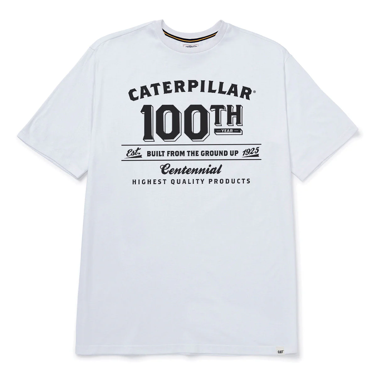 ¡Celebra 100 años con una impresionante gráfica del centenario de la marca CAT en el pecho! Etiqueta de CAT en el dobladillo y estampado en el pecho. ¡Demuestra tu amor por la marca con este llamativo diseño!