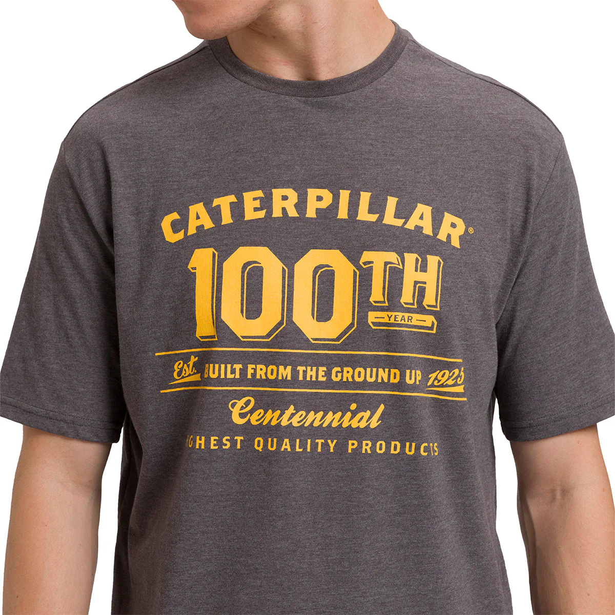¡Celebra 100 años con una impresionante gráfica del centenario de la marca CAT en el pecho! Etiqueta de CAT en el dobladillo y estampado en el pecho. ¡Demuestra tu amor por la marca con este llamativo diseño!