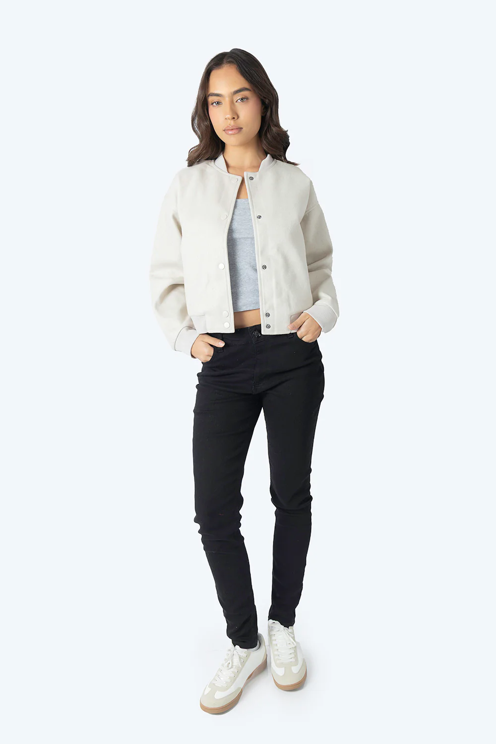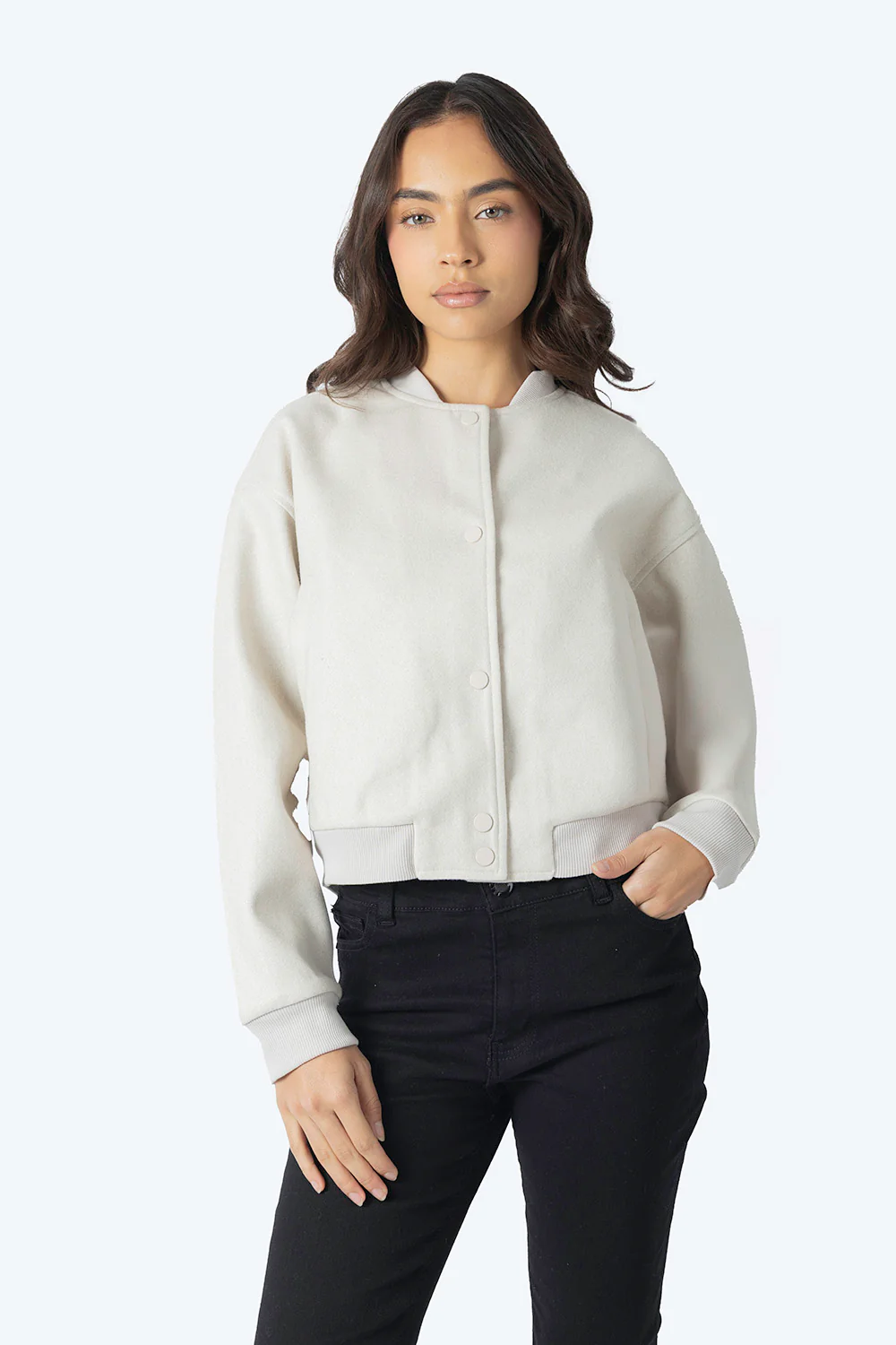 Esta chamarra corta para mujer en color beige claro combina estilo y funcionalidad. Con una camisero de cuello clásico y cierre de botones, ofrece un ajuste cómodo y versátil. Fabricada 100% en poliéster, garantiza durabilidad y fácil cuidado, ideal para complementar cualquier look casual con un toque cómodo.
