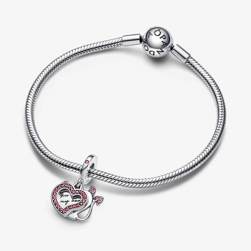 Este dije colgante doble de plata esterlina presenta un corazón calado con una fila de pavé a lo largo del borde y un disco en forma de corazón con cuernos de pavé y una cola de pavé con punta de corazón.