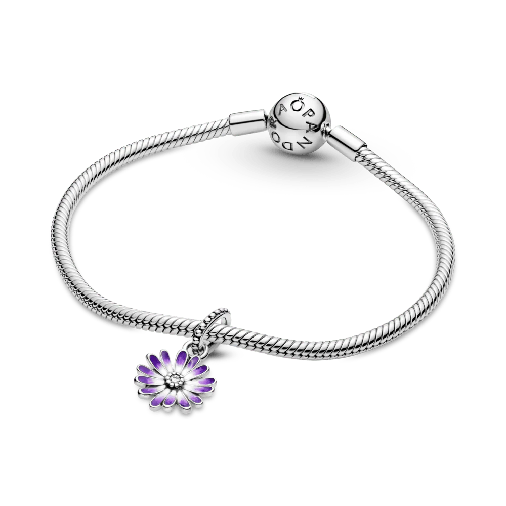 Haz que tu estilo resalte con el charm colgante Margarita morada Este charm de plata esterlina acabado a mano está formado por pétalos de margarita pintados a mano con esmalte en tonos lavanda, morado y blanco, una circonia cúbica transparente rodeada de microabalorios en el centro de la flor y un detalle de corazón pulido en el reverso. Inspirado en la idea de que cada flor es única y representa la diversidad, la comunidad y la llegada de la primavera, este charm hará brillar cada día.