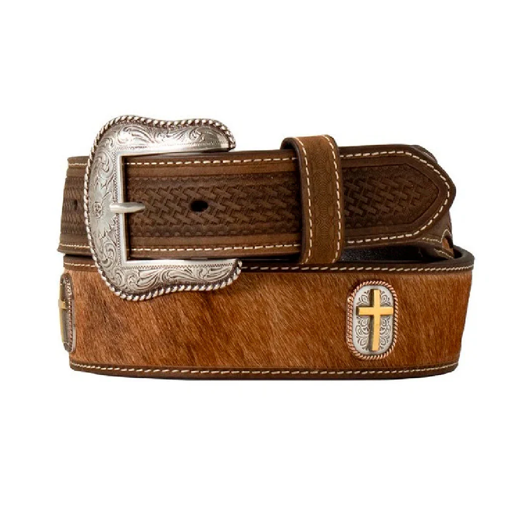 El cinturón Nocona de alta calidad para hombre de M&F Western Products presenta un cuerpo de pelo de becerro marrón con detalles de cuero Crazy Horse repujado con trama de estera. Adornado con conchos con una cruz grabada en relieve en oro antiguo, cobre y plata, y un borde de cuerda. Rematado con una hebilla grabada con volutas.