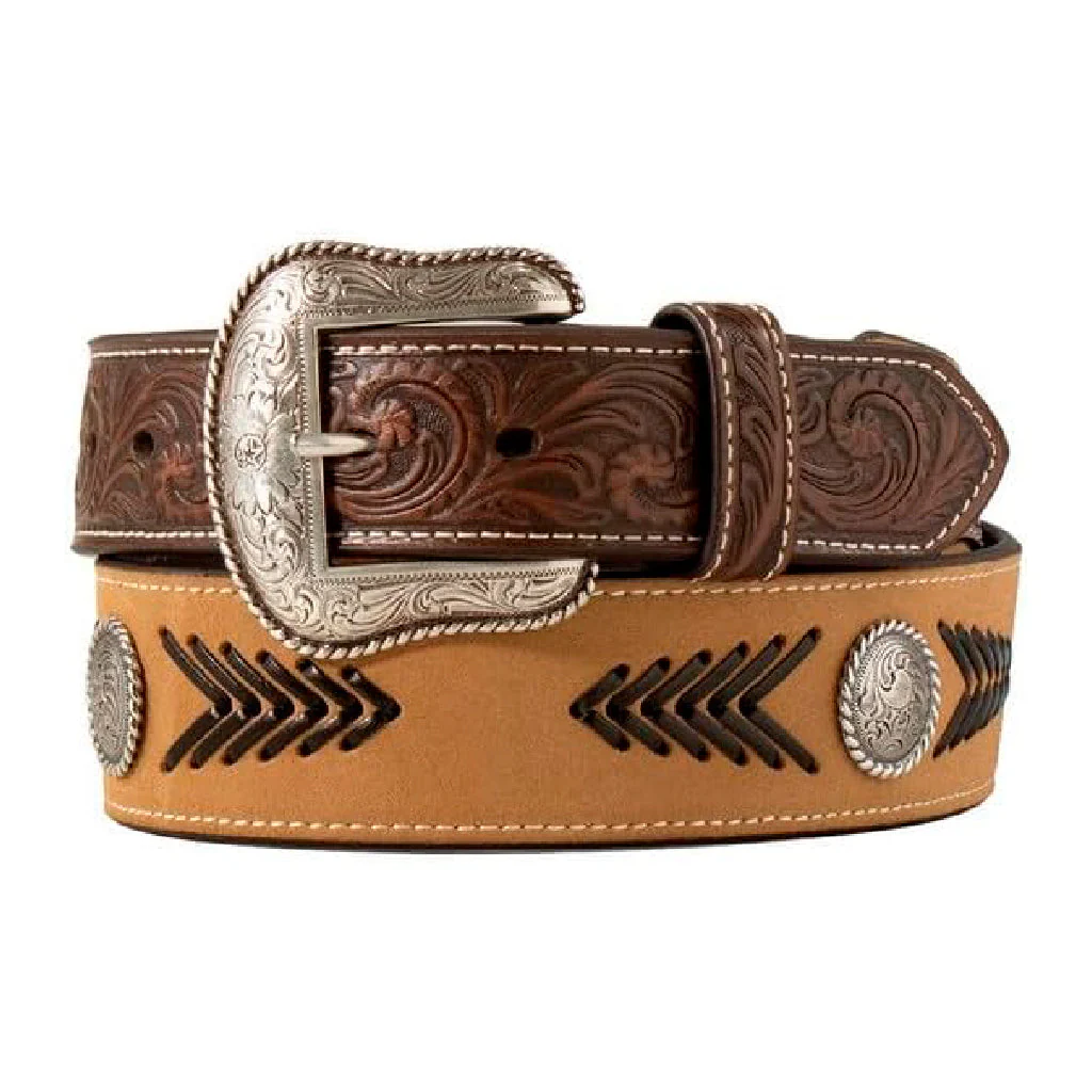 Cinturón Nocona de calidad para hombre de M&F Western Products. Presenta un cuerpo robusto con lengüetas de volutas en relieve. Cordoncillo de chevrón color chocolate y conchos a lo largo del cuerpo. Rematado con una hebilla de plata antigua con un diseño floral grabado y borde de cuerda.