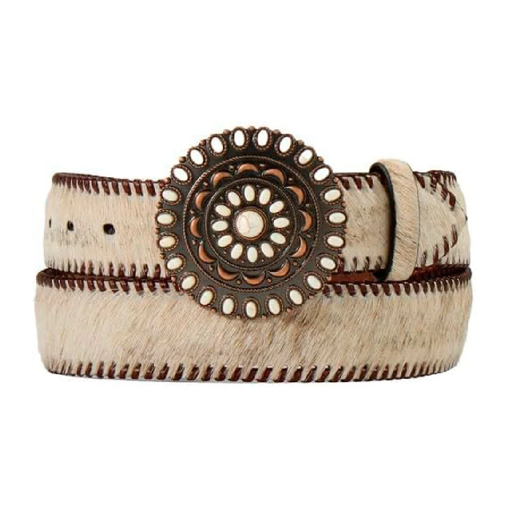 Cinturón Nocona para mujer de M&F Western Products. La correa de cuero genuino está hecha de pelo de becerro claro, con un pespunte marrón en los bordes. Perfectamente acentuado por una hebilla circular de cobre con piedras blancas.
