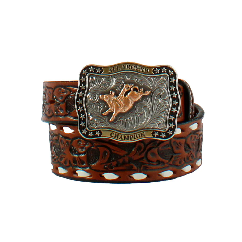 El cinturón 3D para niño de M&F Western Products presenta un cuerpo floral labrado a mano con pespuntes blancos que recorren los bordes exteriores. La hebilla luce un jinete de toro con acabado tricolor.