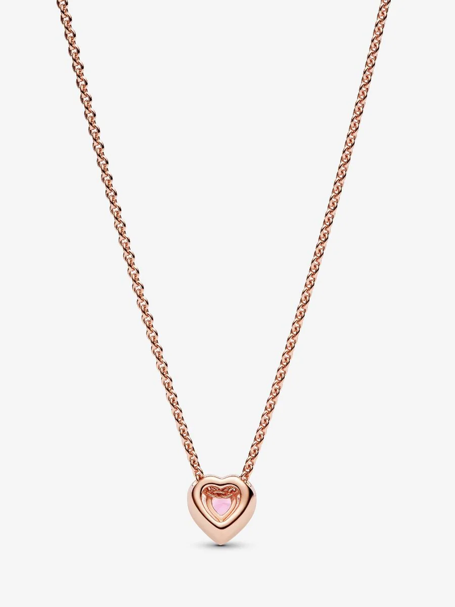 Dale un toque sofisticado a tu look con el Collar Corazón Brillante Oro Rosa. El collar se inspira en nuestra clásica colección Pandora Timeless. Acabado a mano con una aleación única de metales con un recubrimiento electrolítico de oro rosa de segunda ley de 14K, esta joya presenta una gema central más elevada con forma de corazón de color rosa. Las circonitas cúbicas transparentes crean un halo y decoran la mitad del eje de la alianza, que además presenta el logotipo de Pandora en su interior. Combina este collar con otros acabados a mano en plata de primera ley para crear un look único.