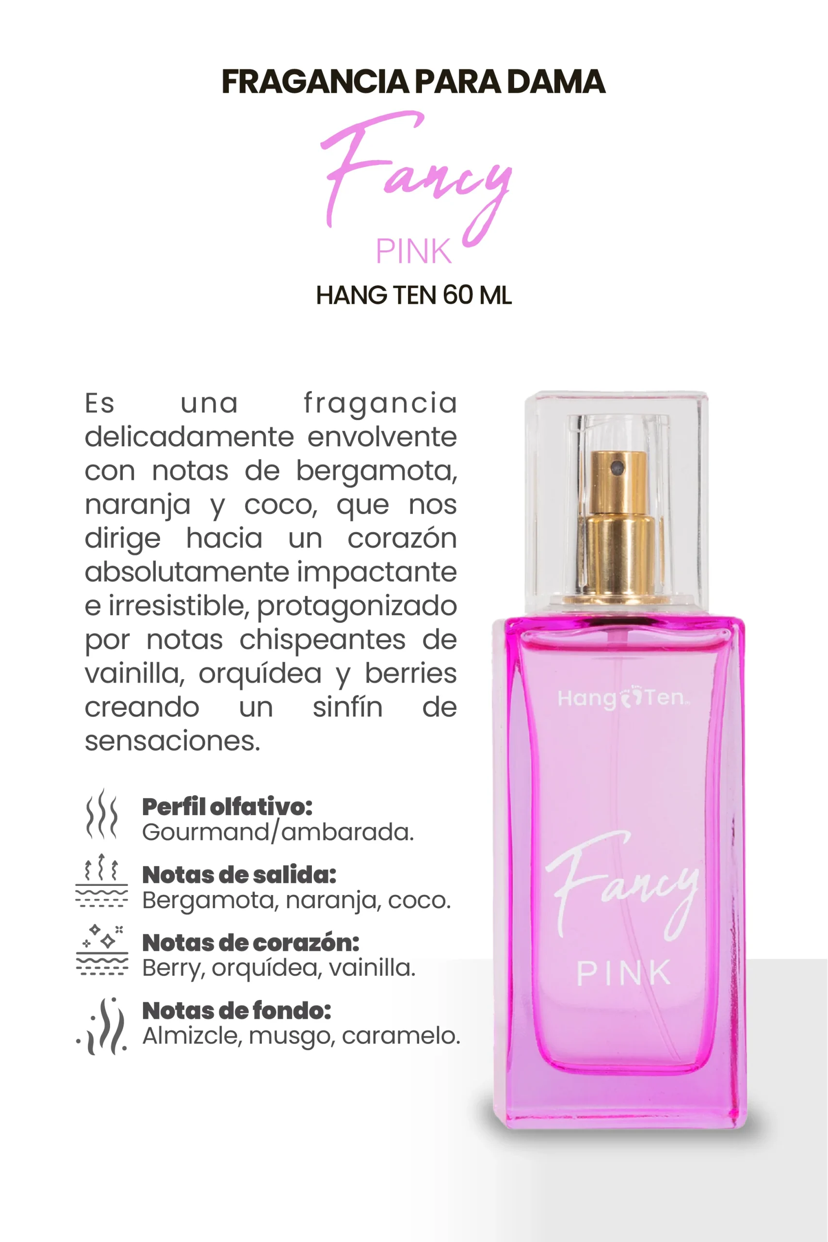 Fragancia Fancy Pink 60 ml ofrece un perfil olfativo gourmand y ambarado que combina la frescura cítrica de bergamota y naranja con la delicadeza floral de orquídea. Su base de vainilla y musgo aporta profundidad y calidez, creando una experiencia aromática sofisticada y duradera para quienes buscan un aroma equilibrado y distintivo. Ideal para uso diario o ocasiones especiales.