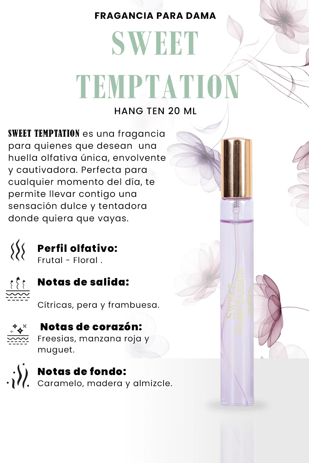Fragancia Sweet Temptation 20 ml ofrece una combinación experta de notas florales y frutales que despiertan los sentidos. Su perfil olfativo inicia con la frescura jugosa de pera y manzana roja, evolucionando hacia la dulzura cautivadora del caramelo. En su base, aromas de madera y almizcle aportan profundidad y sofisticación. Ideal para quienes buscan una fragancia equilibrada y duradera que se adapta a diversas ocasiones.