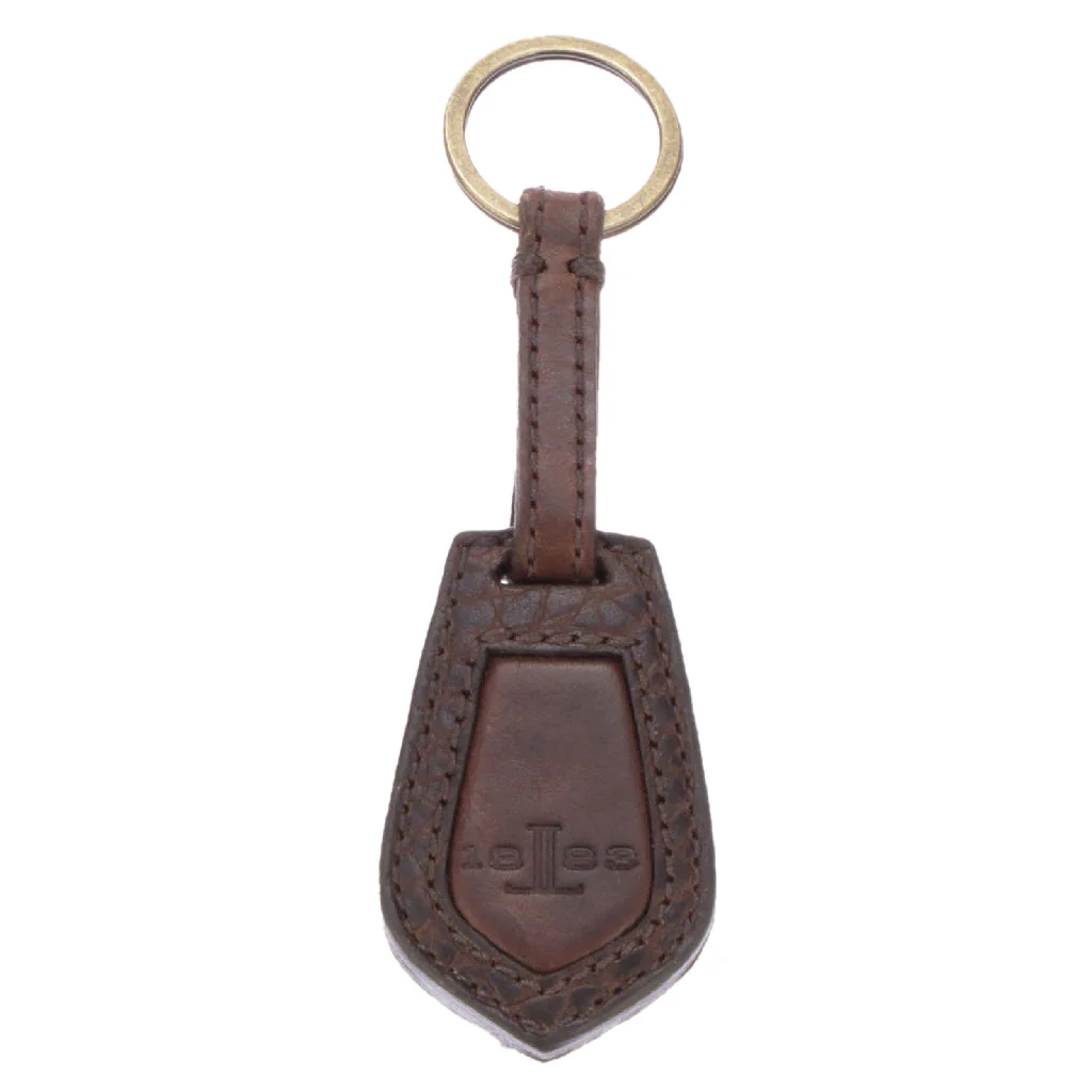 Elaborado con pieles color chocolate, este elegante llavero Lucchese complementa a la perfección su colección de bolsos. Características: 3,8 cm de ancho x 6,35 cm de alto. Fabricado con piel de vacuno granulada de plena flor y piel de vacuno lisa de flor plana. Estampado con el logotipo de Lucchese 1883. Sujeta las llaves de forma segura en una anilla de latón. Importado