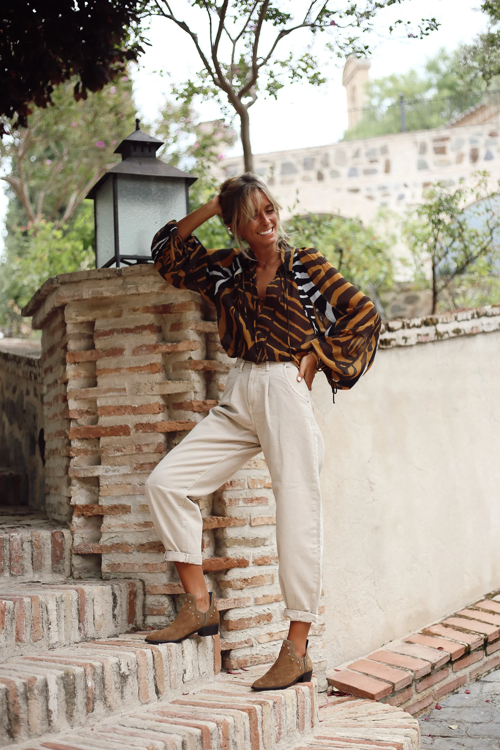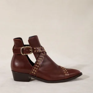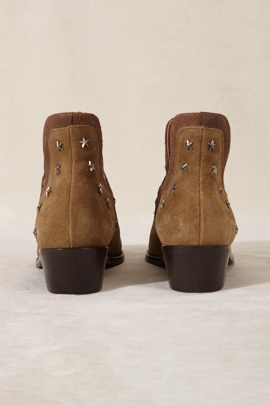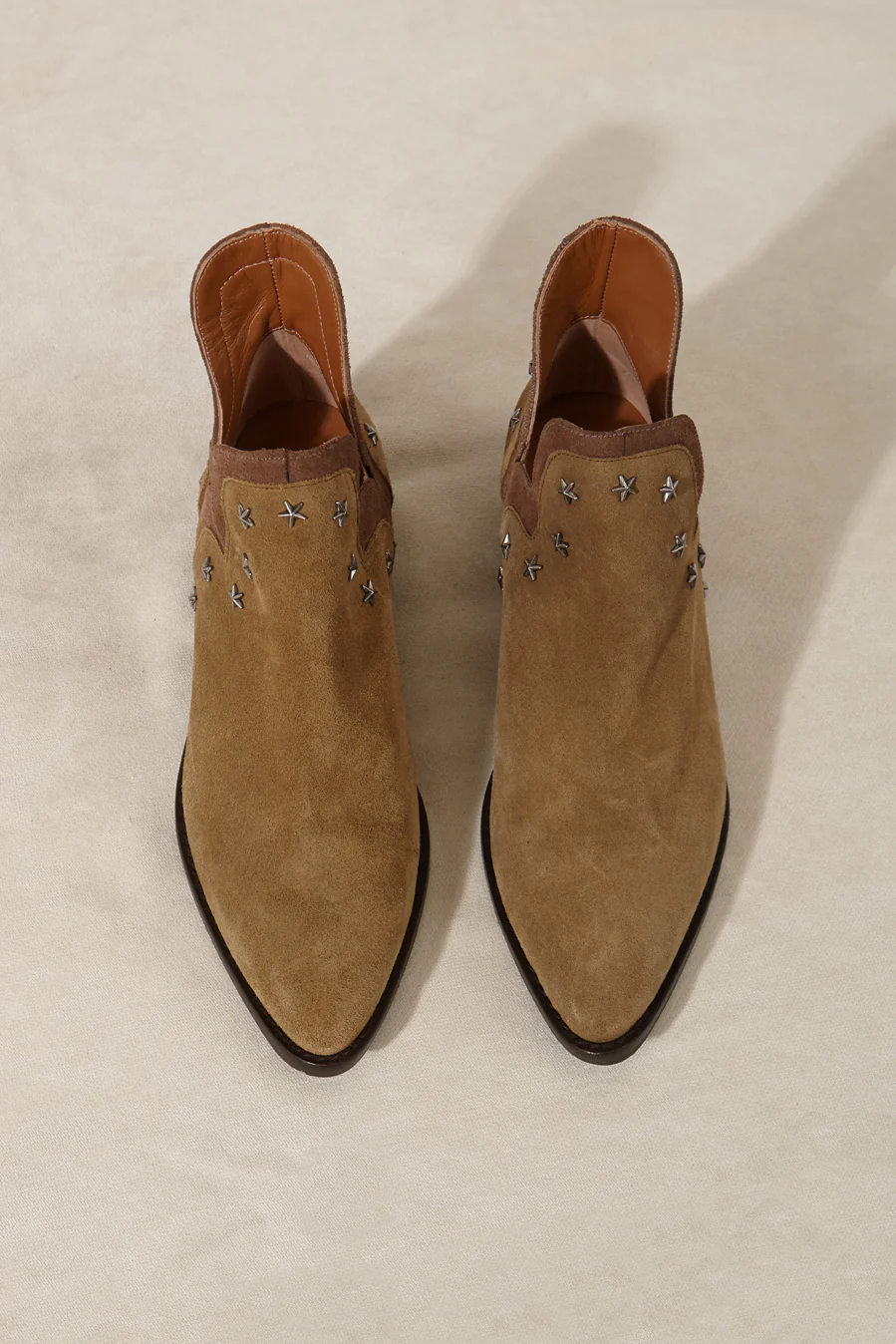 Nuestras icónicas Nay Boots en piel seraje en tostado son el equilibrio perfecto entre atemporalidad y carácter. Silueta abierta en el tobillo rematada con ribete de ante a tono, ofrece un acabado versátil. Detalles de tachas metálicas de estrellas hipoalérgicas en tono plata que marcan la esencia Micuir a cada paso. Presenta un tacón de 4 cm de altura con plantilla de microgel para un mayor confort. Forro y plantilla de piel mestizo de cabra a tono y planta con certificado »handmade in Spain» con logo grabado a fuego. Incluye una bolsa de algodón. Diseñado y fabricado artesanalmente en España.