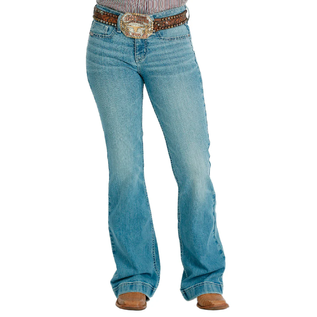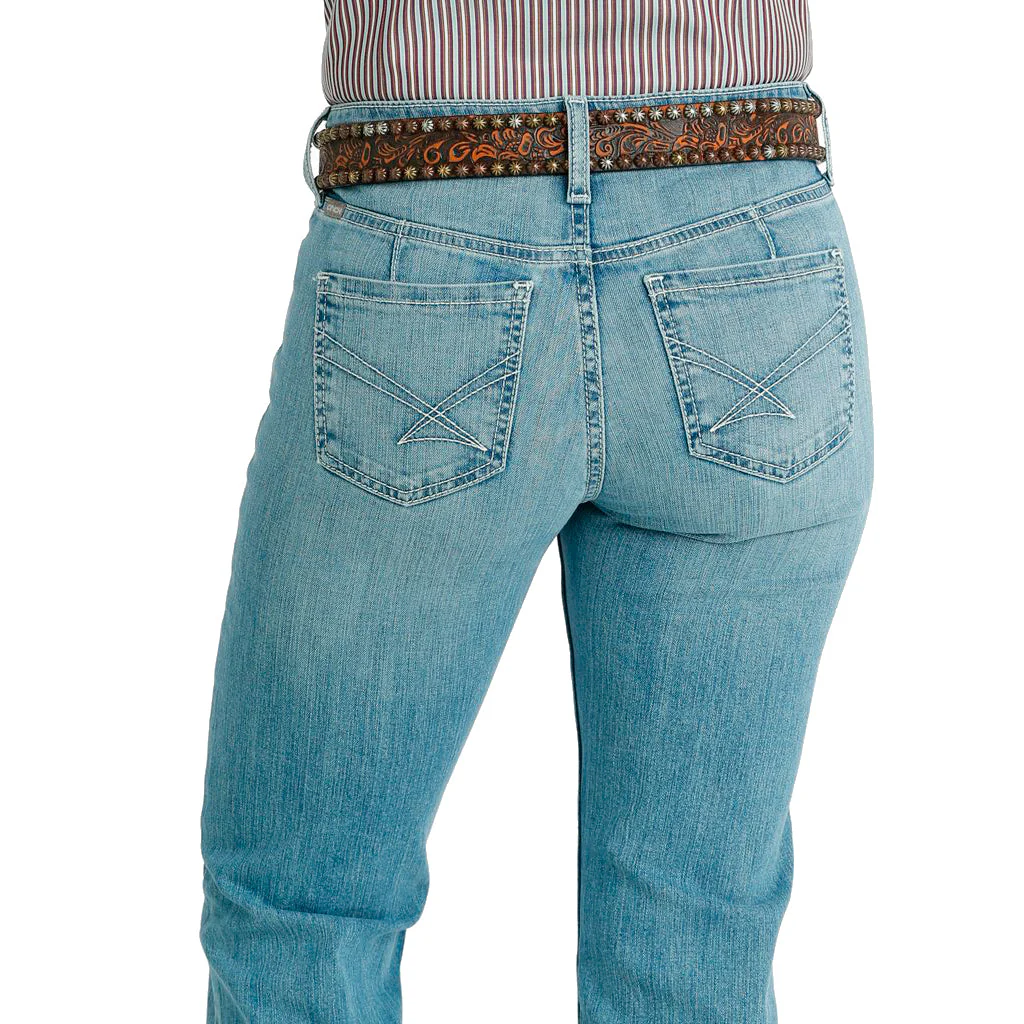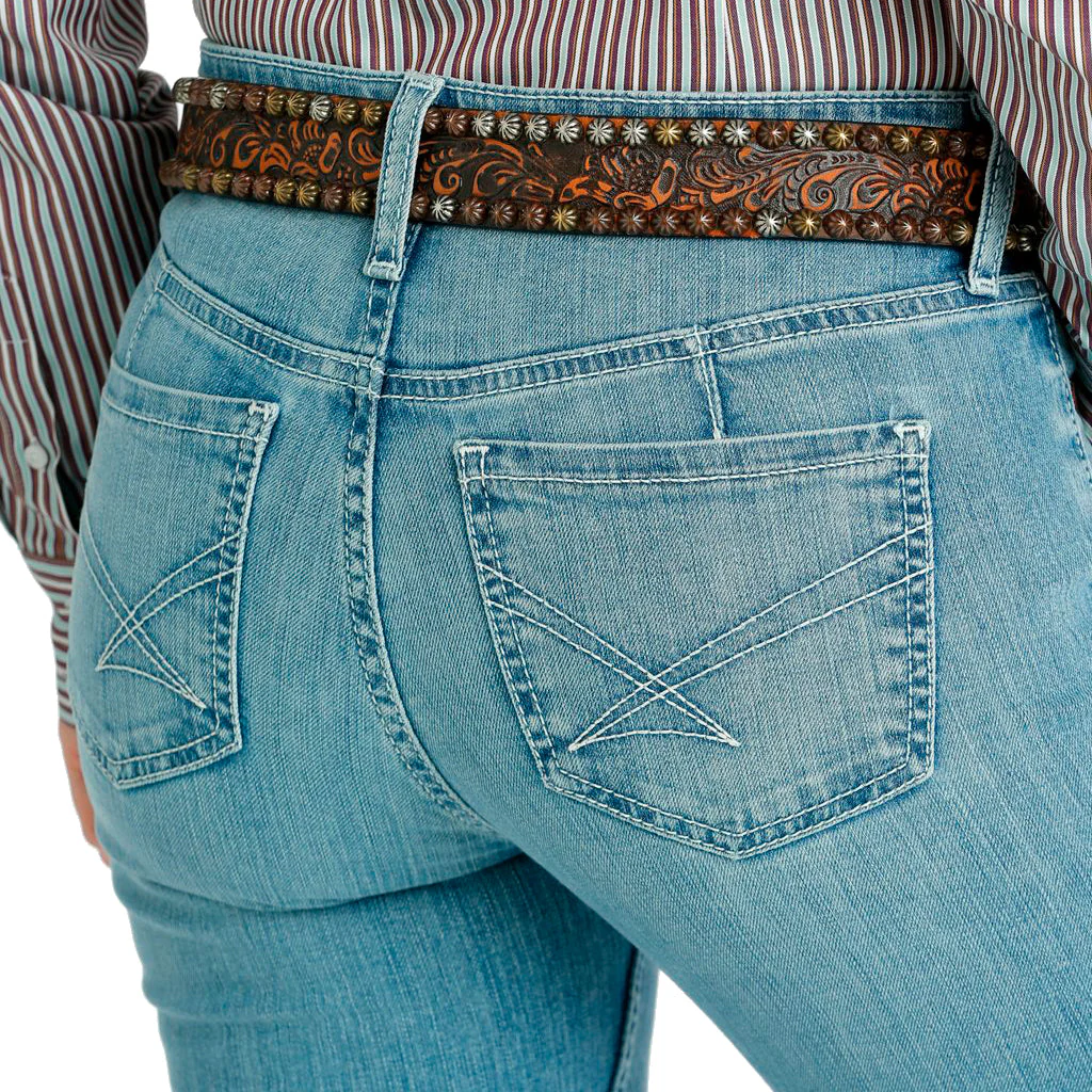 EL Modelo Jenna, con su ajuste ceñido, aumento de rendimiento y pierna recta, está preparada para la arena. La mezclilla de lavado a la piedra oscura, con tinte complementario y costuras decorativas de tabaco, presenta una sencilla puntada de bolsillo trasero en azul tonal.