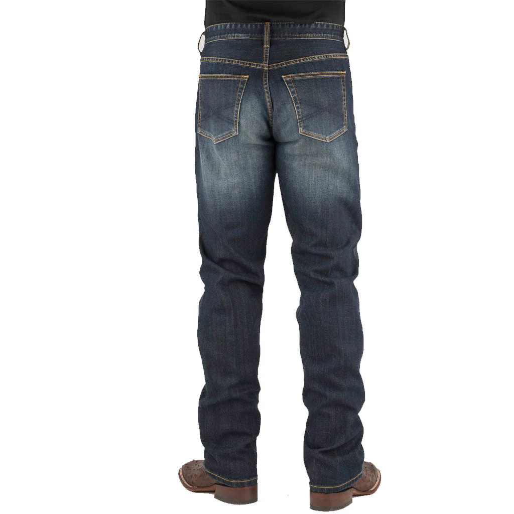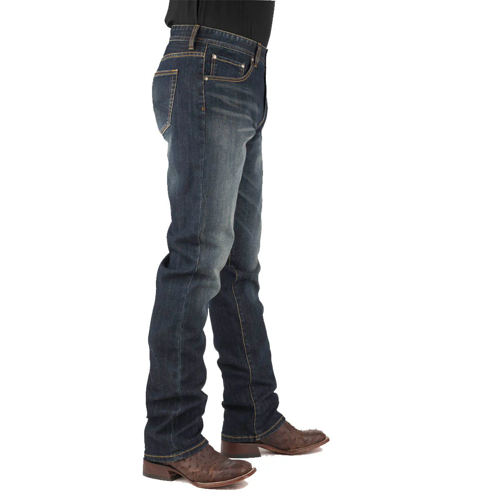 Estos pantalones vaqueros rectos estilo western para hombre de Stetson están confeccionados con 98 % algodón, 2 % elastano y cuentan con un talle ligeramente más bajo y un corte recto en el muslo con una abertura recta en la pierna. Tienen estilo de 5 bolsillos, pespuntes en forma de X en los bolsillos traseros, detalle de bigotes y lijado a mano, y botones, remaches y cremallera con la marca Stetson.