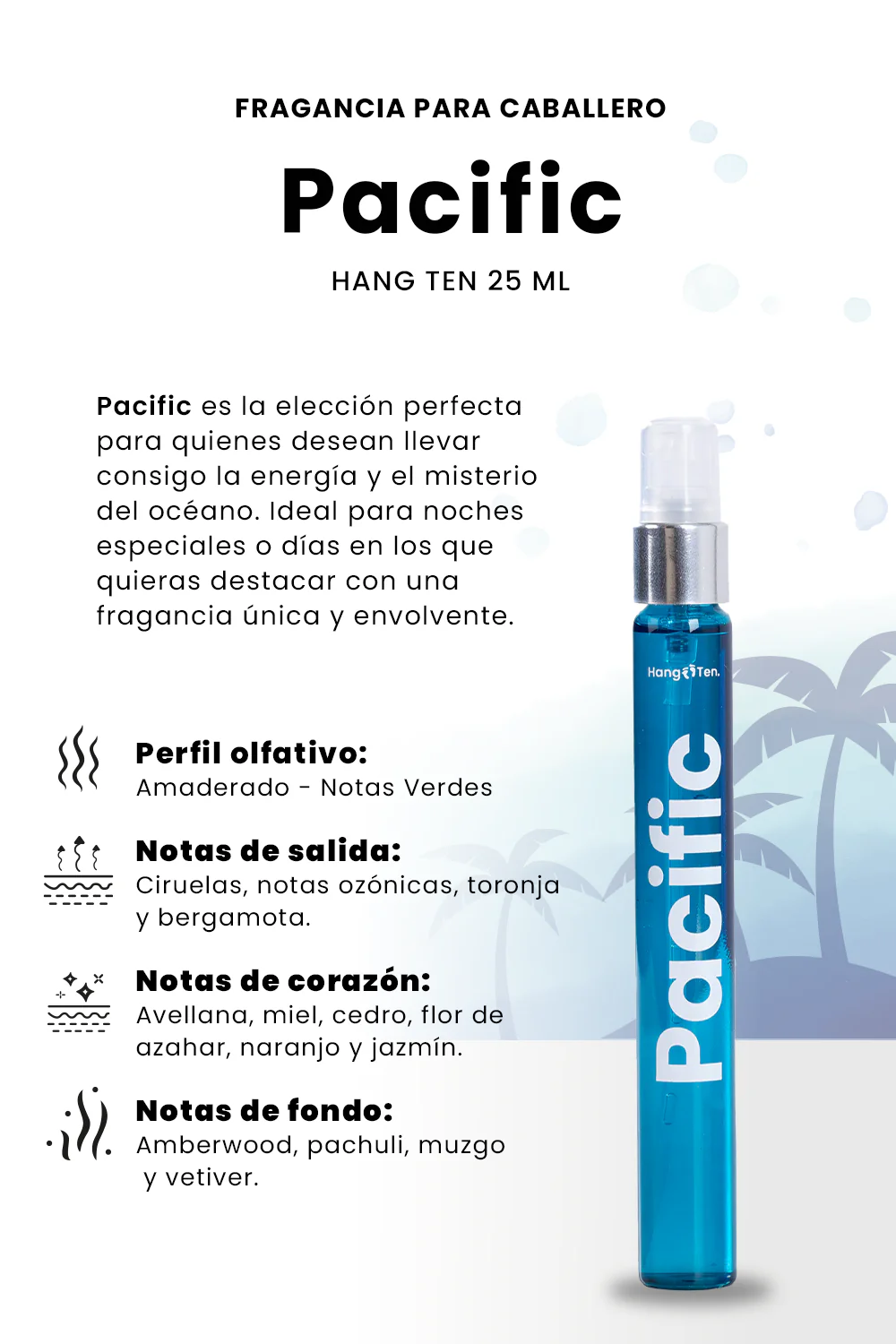 Capture la esencia fresca y sofisticada con el Perfume Pacific 25ml para caballero. Su combinación de notas cítricas como toronja y bergamota se equilibra con un perfil amaderado enriquecido por cedro y pachulí. Esta fragancia ofrece un carácter moderno y refinado, ideal para el hombre que busca una presencia elegante con un toque verde y natural. Perfecto para el día a día o momentos especiales, aporta frescura duradera y un estilo auténtico.