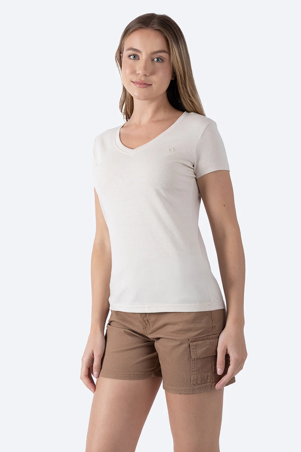 Esta playera básica beige claro para mujer está confeccionada con una mezcla de 60% algodón y 40% poliéster, que garantiza suavidad y resistencia. Su diseño de cuello en V y manga corta ofrece un estilo clásico y cómodo, ideal para cualquier ocasión casual. Una prenda esencial que combina funcionalidad y versatilidad en el guardarropa femenino.
