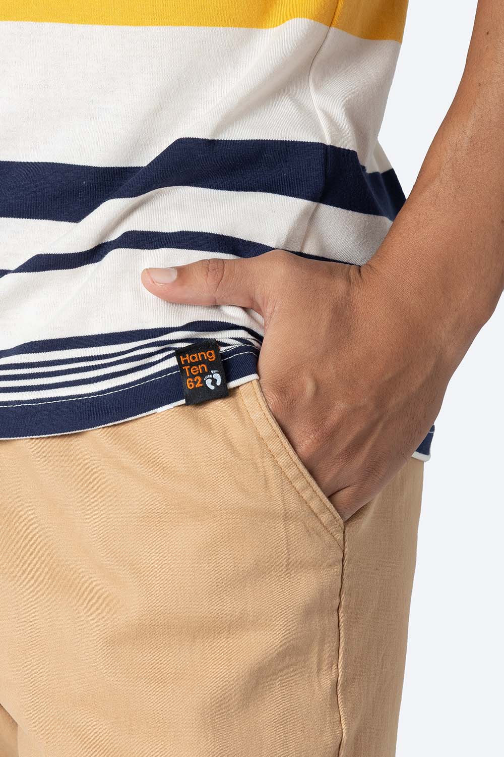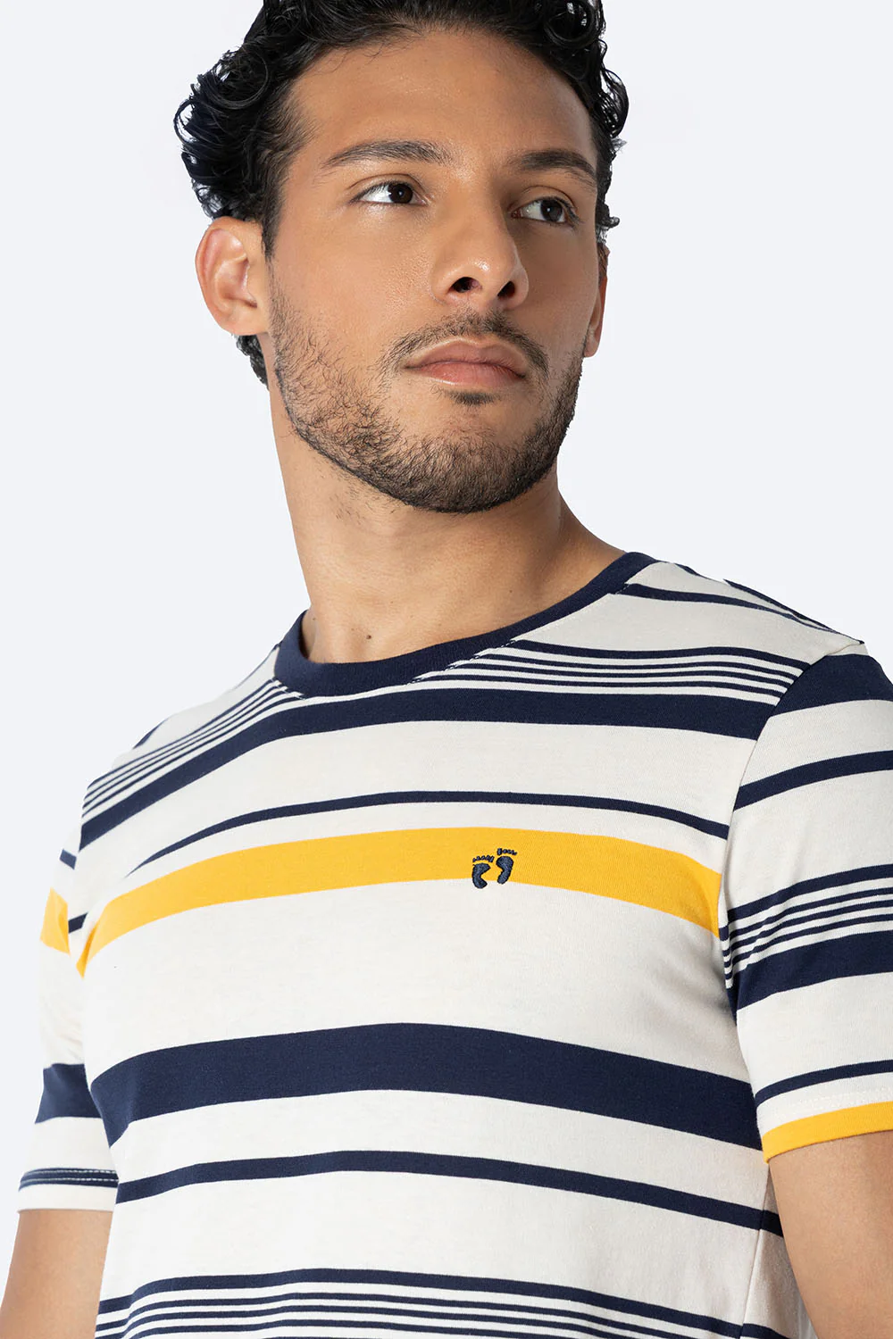 Esta playera de manga corta para hombre combina estilo y comodidad con su diseño rayado en tonos beige, azul marino y amarillo. Confeccionada en una mezcla equilibrada de 50% algodón y 50% poliéster, ofrece suavidad y durabilidad, ideal para uso diario. El cuello redondo proporciona un corte clásico que se adapta a diversas ocasiones, desde casuales hasta semiformales. Perfecta para quienes buscan una prenda versátil y con un toque moderno en su guardarropa.