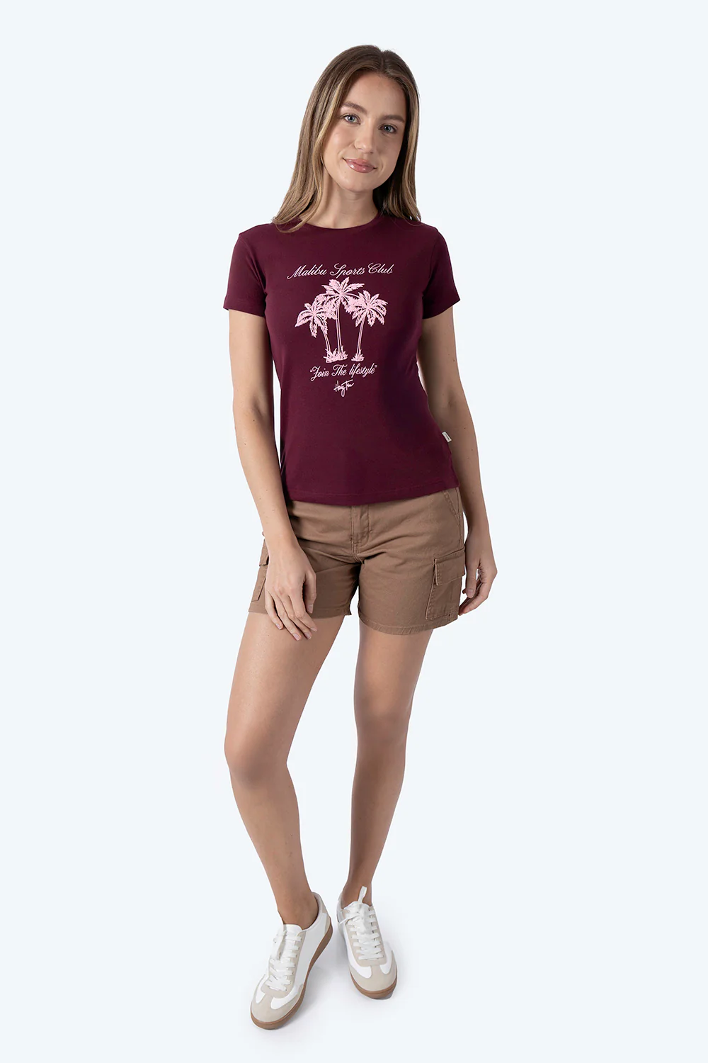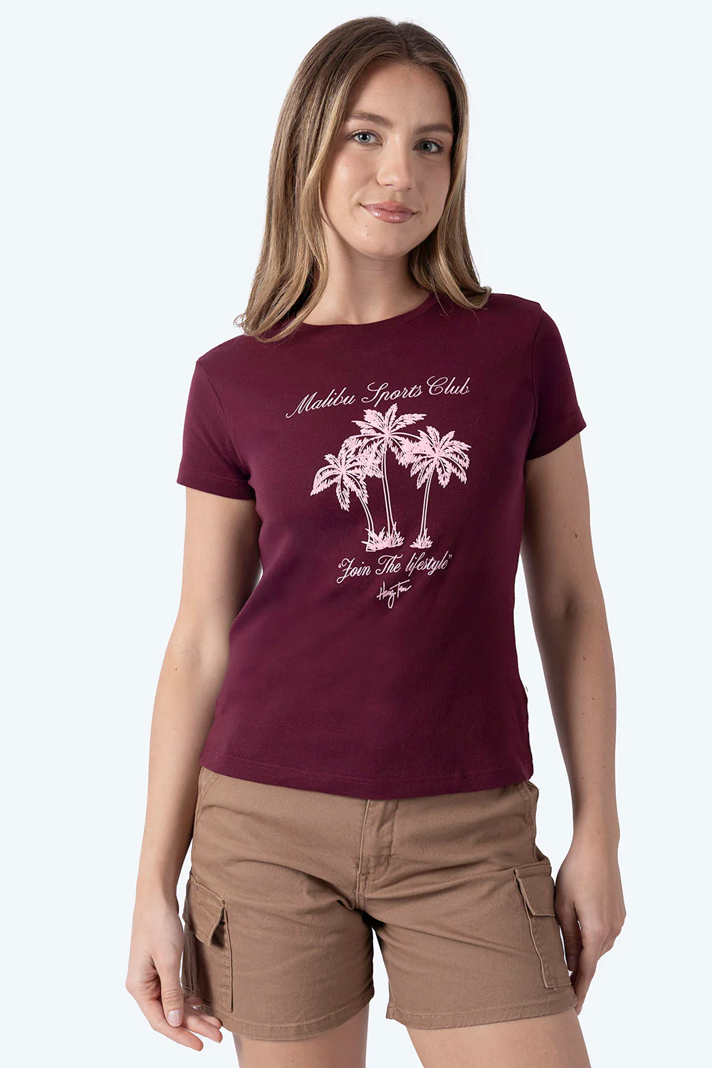 Esta playera para mujer en color vino combina algodón y poliéster al 50%, ofreciendo comodidad y durabilidad. Su cuello redondo y manga corta aseguran un ajuste cómodo y fresco, ideal para el clima cálido. El estampado de palmeras “Malibu Sports Club” aporta un toque moderno y casual, perfecto para un look relajado y versátil.