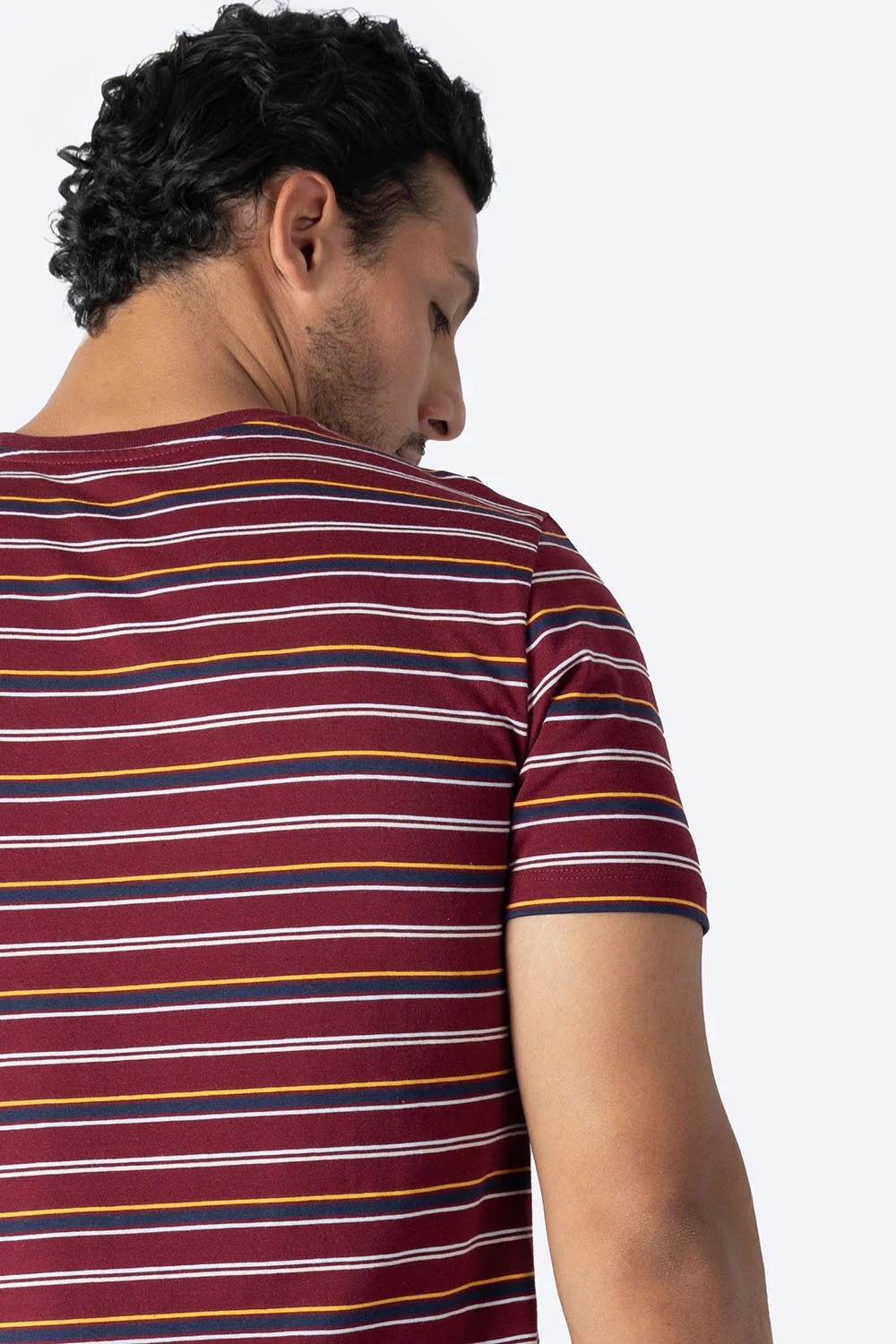 Esta playera de manga corta para hombre combina estilo y comodidad con su diseño rayado en tonos vino, azul marino, blanco y amarillo. Confeccionada en una mezcla equilibrada de 50% algodón y 50% poliéster, ofrece suavidad y durabilidad, ideal para uso diario. El cuello redondo proporciona un corte clásico que se adapta a diversas ocasiones, desde casuales hasta semi-formales. Perfecta para quienes buscan una prenda versátil y con un toque moderno en su guardarropa.