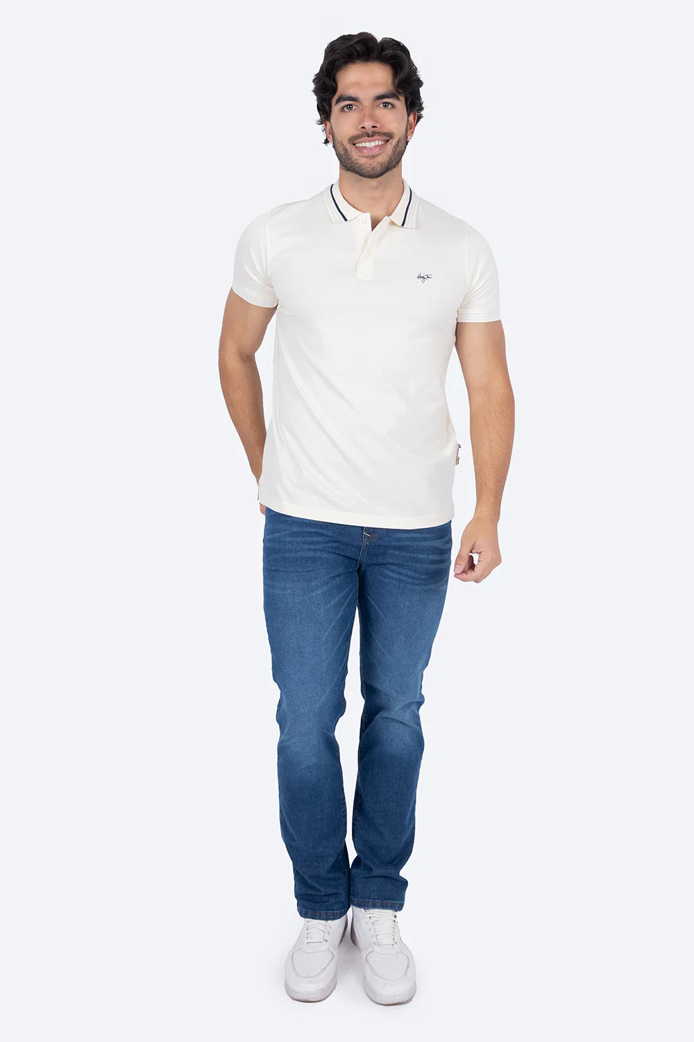 Este polo de chifón beige destaca por sus filos en contraste en tonos azules, que aportan un toque moderno y sofisticado. Su logo bordado añade un detalle de calidad, mientras que la manga corta garantiza comodidad y frescura. Ideal para quienes buscan un estilo elegante y contemporáneo sin sacrificar confort.