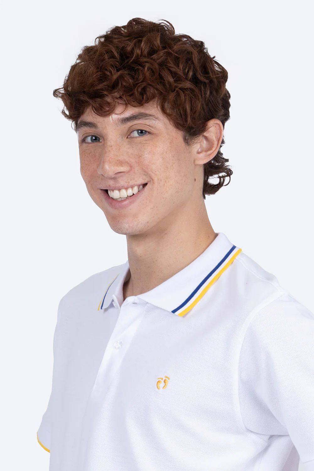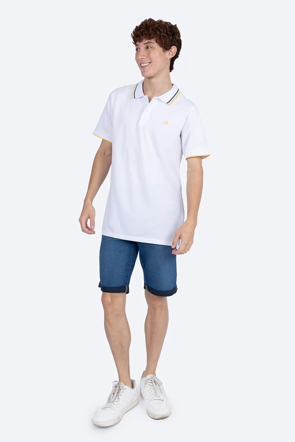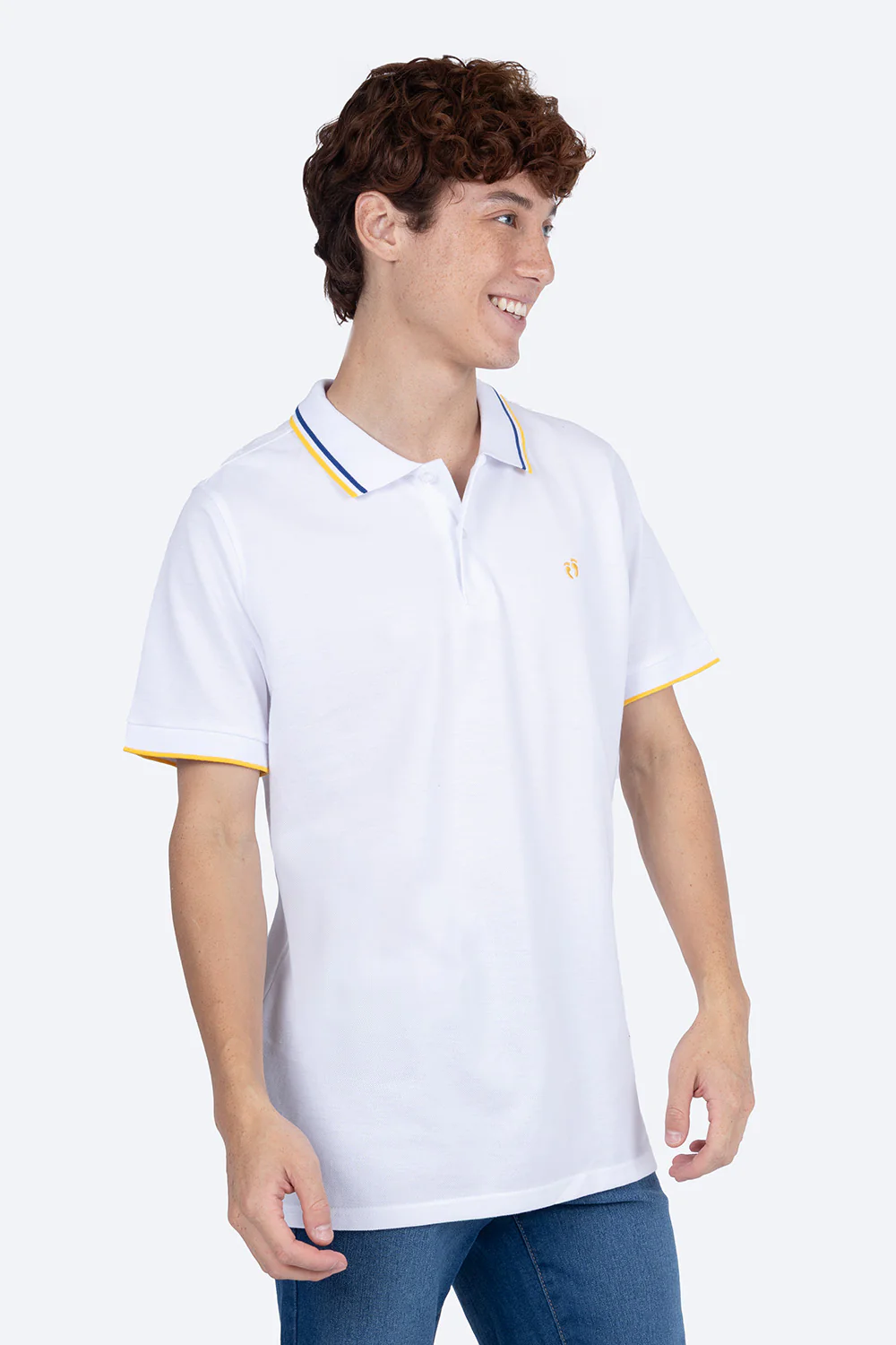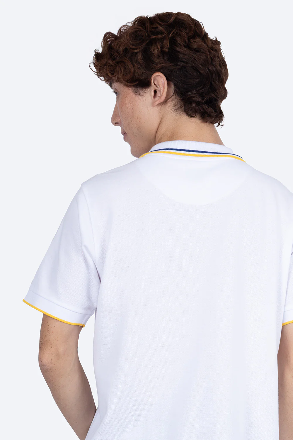 Este polo piqué blanca destaca por sus filos en contraste en tonos azul y amarillo, que aportan un toque moderno y sofisticado. Su logo bordado añade un detalle de calidad, mientras que la manga corta garantiza comodidad y frescura. Ideal para quienes buscan un estilo elegante y contemporáneo sin sacrificar confort.