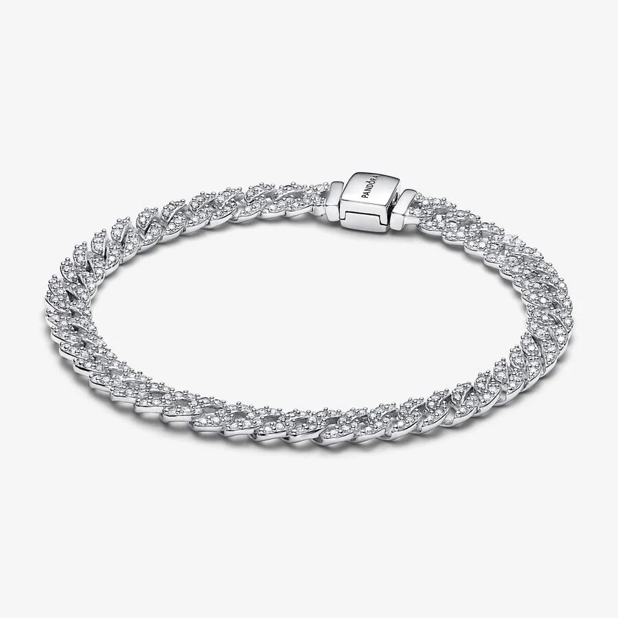 Potencia tu look con nuestro guillo pandora. Esta pulsera en plata de primera ley es una cadena de brillantes eslabones. La parte superior de cada semicírculo se ha embellecido con tres gemas con talla redonda, mientras que la parte trasera de la cadena está pulida para darle brillo y que sea cómoda de llevar. La pulsera se cierra con un cierre plano cuadrado con el logotipo de Pandora grabado. Combinando la geometría lineal de nuestras icónicas cadenas con brillante pavé, esta pulsera de cadena en plata de primera ley será una pieza para siempre.
