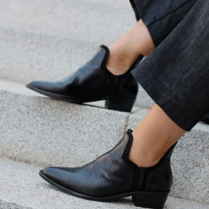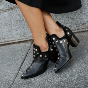 Nuestras icónicas Punky Boots en piel vacuna negra son el equilibrio perfecto entre atemporalidad y carácter. Silueta abierta en el tobillo rematada con ribete a tono, ofrece un acabado versátil. Detalles de tachas metálicas hipoalérgicas en tono dorado que marcan la esencia Micuir a cada paso. Presenta un tacón de 4 cm de altura con plantilla de microgel para un mayor confort. Forro y plantilla de piel mestizo de cabra a tono y planta con certificado »handmade in Spain» con logo grabado a fuego. Incluye una bolsa de algodón. Diseñado y fabricado artesanalmente en España.
