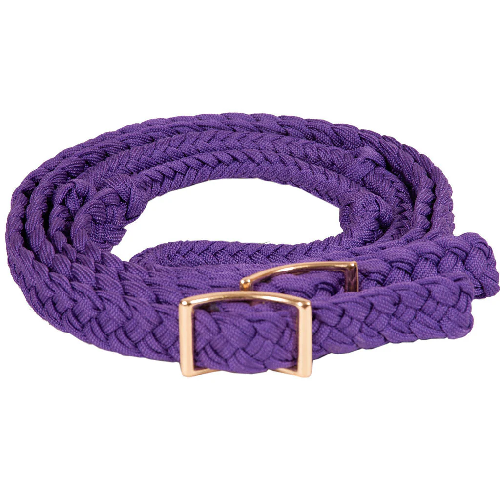Nylon trenzado plano con revestimiento de cera y cordones de colores en el borde para darle un toque de color. Rein presenta un Conway niquelado y extremos de gatillo. Tamaño 3/4 ″ x 8 ′.