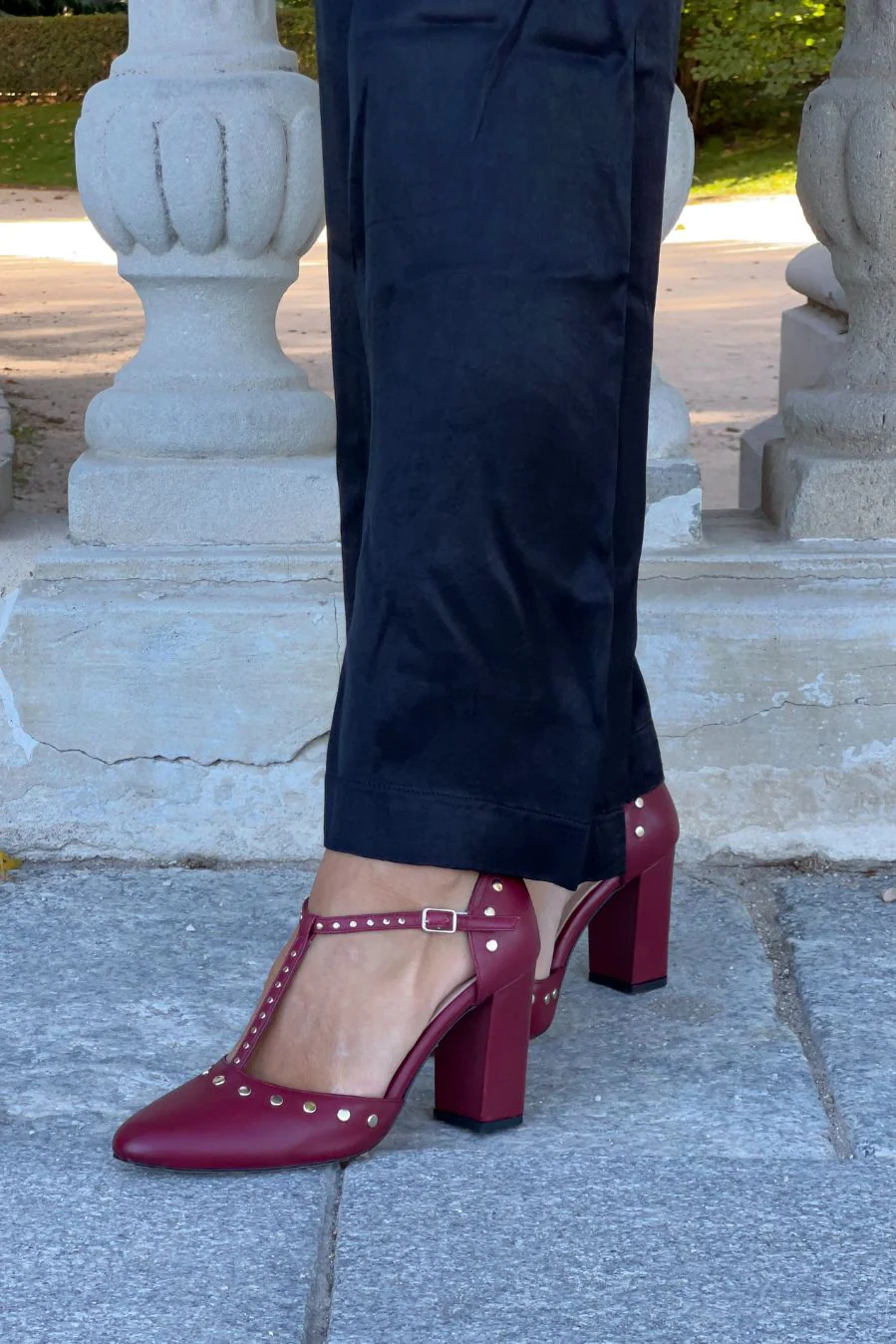 - Zapato de tacón ancho en piel grabada en color burdeos y cierre de pulsera T-Bar con hebilla.