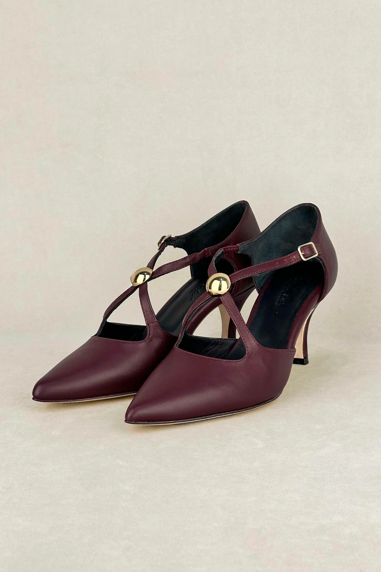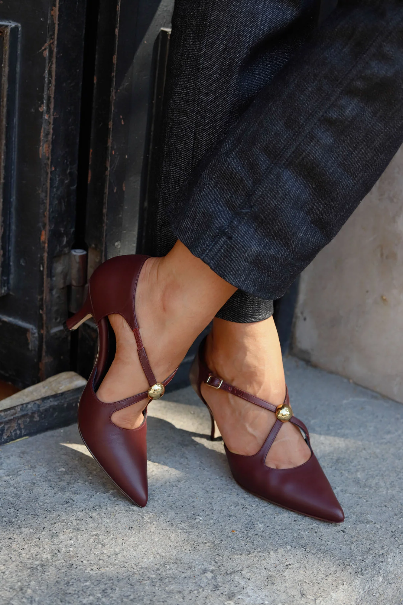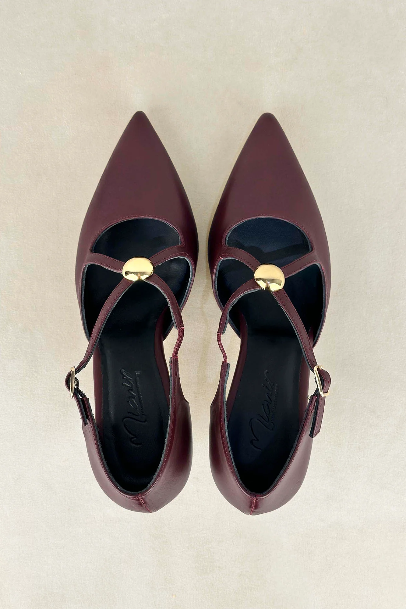Zapato de salón en piel burdeos. Su diseño de puntera fina y escote marcado en cruce en empeine aporta un estilo chic y moderno. Diseño único con tacha metálica en empeine y cierre con hebilla en tobillo . Presenta tacón fino de 7 cm de altura con plantilla de microgel para un mayor confort. Forro y plantilla de piel mestizo de cabra a tono y planta con certificado »handmade in Spain» con logo grabado a fuego. Incluye una bolsa de algodón. Diseñado y fabricado artesanalmente en España.