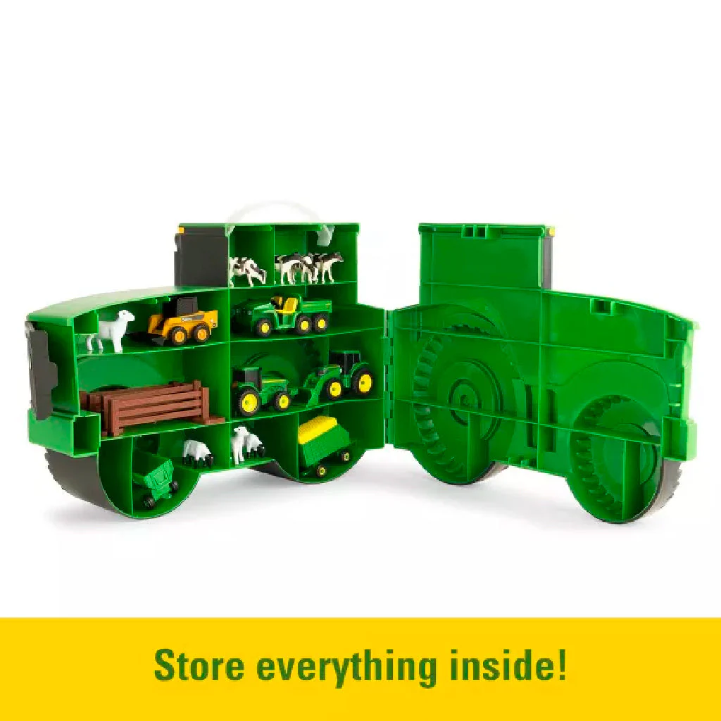 ¡Empieza la colección de tu pequeño granjero con el Maletín para Tractores John Deere! Este amplio maletín para tractores cuenta con pestillo y asa, lo que lo convierte en el juego de juguetes perfecto para llevar de viaje. Al abrirlo, se revelan compartimentos ideales para guardar los vehículos, animales y cercas incluidos. Con dos tractores, un gator y una minicargadora, hay muchísimas maneras de inspirar el juego creativo, tanto en casa como fuera de ella.