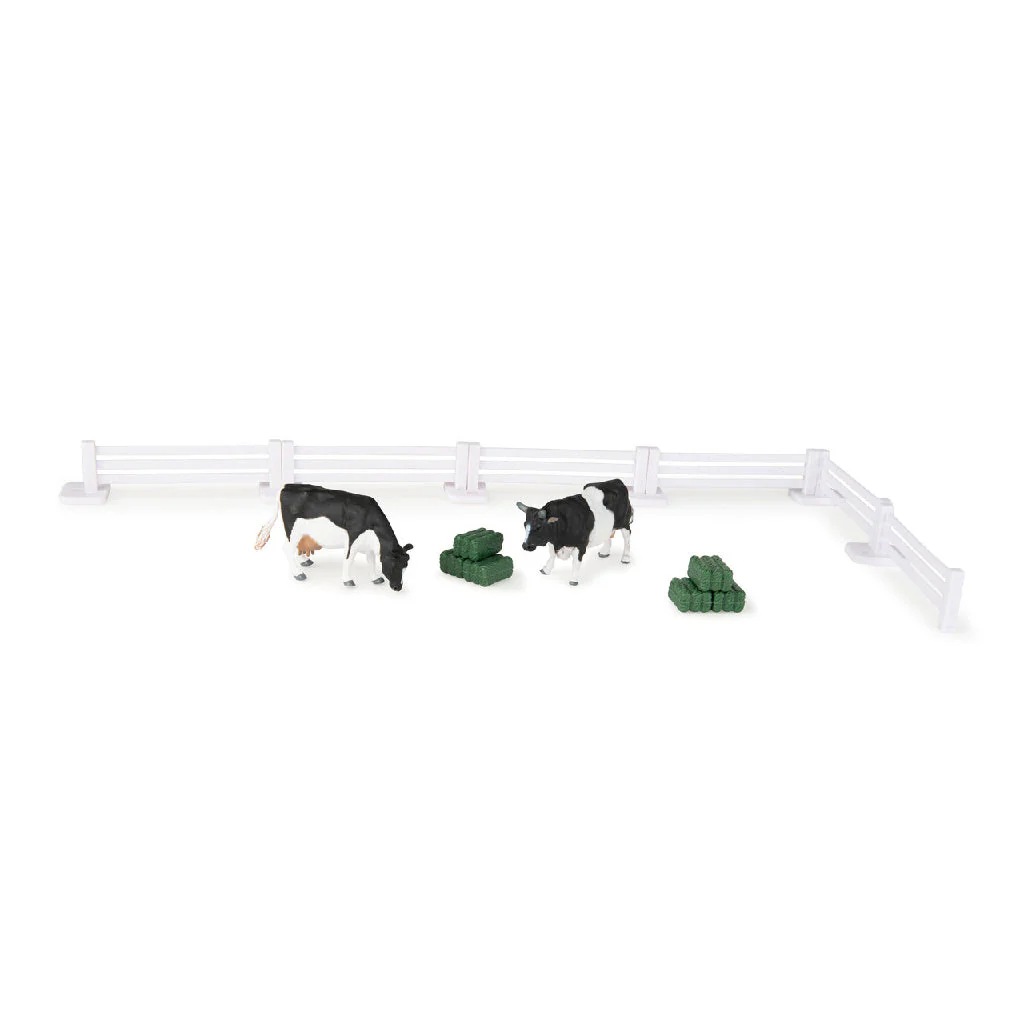 - Diversión con juguetes de granja: mantén a las vacas de juguete seguras usando las piezas de cerca incluidas para construir un recinto.
